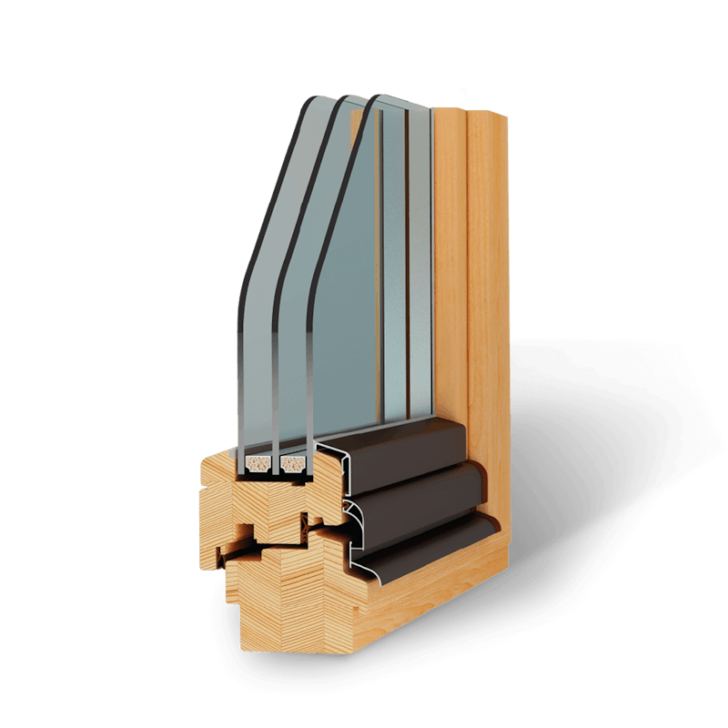 Сосновий зрощений дерев’яний брус, система “Термоплюс-78”, лакофарбове покриття Adler, колір "Goverla 2061" (натуральний ефект). Алюмінієва накладка системи Gemini classic, колір RAL 7016 mat, склопакети товщиною 48 мм, мультифункційні