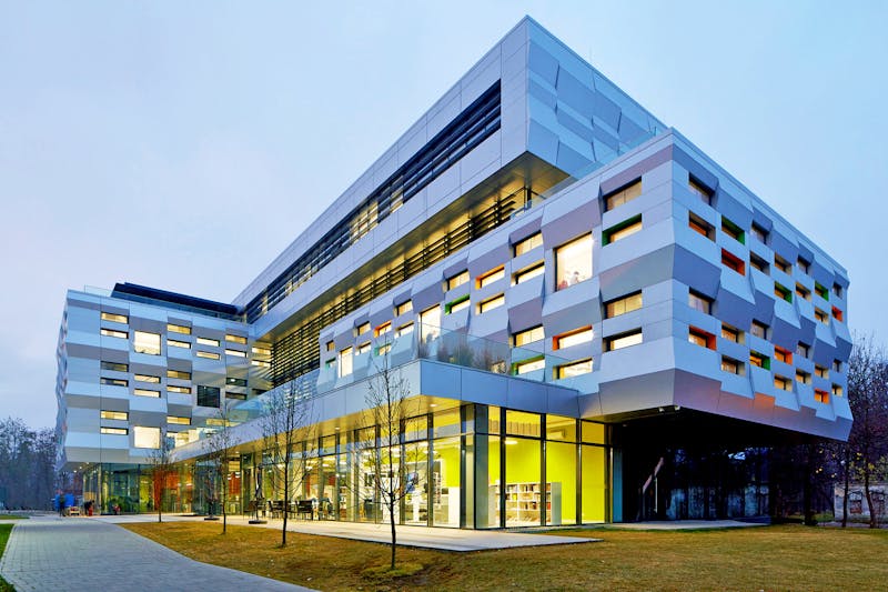 Скляні алюмінієві фасади система Reynaers CW 50 HI, колір RAL 7016, дверна група CS 77 HI. Склопакети двокамерні з мультифункційним та енергозберігаючим склом. Білі склопакети – це емаліти пофарбовані в колір Ral 9018