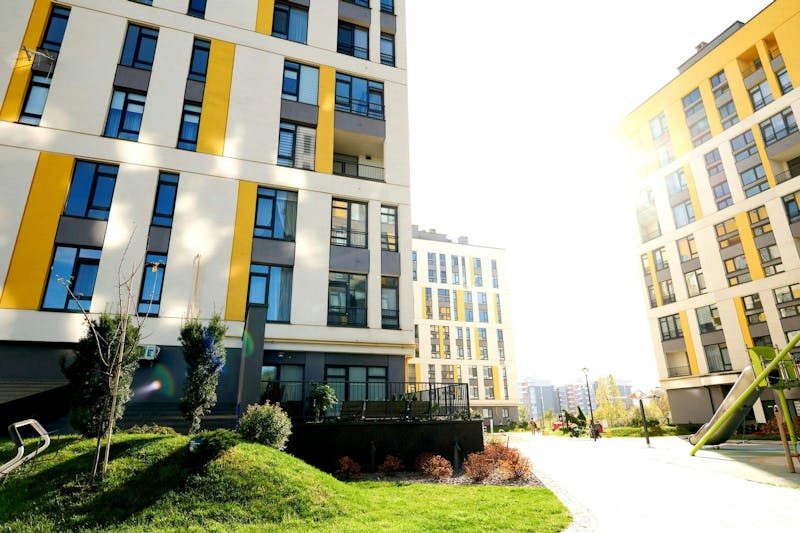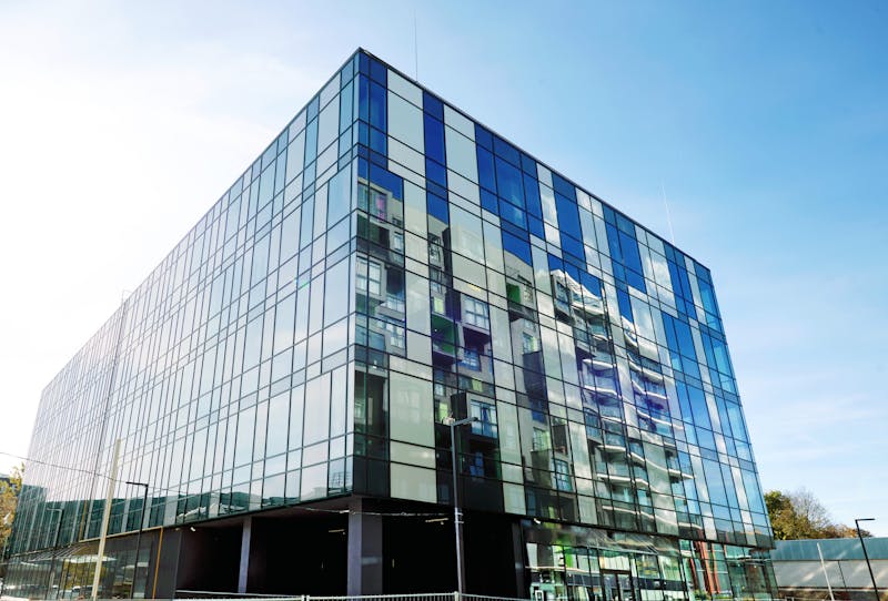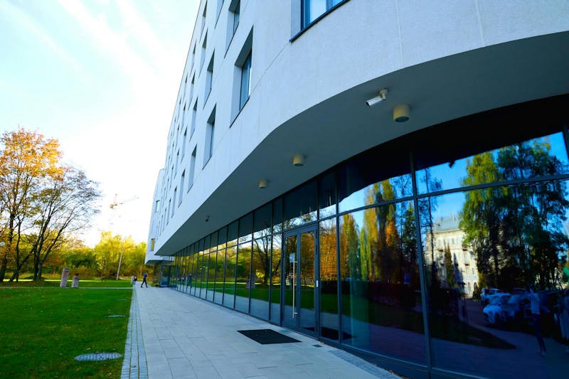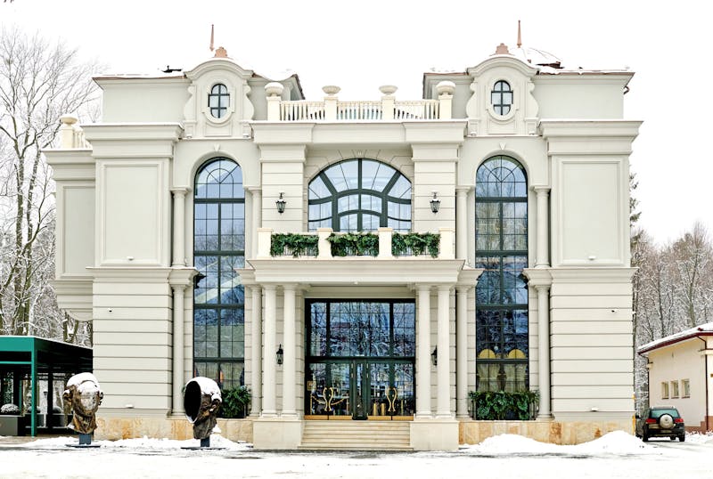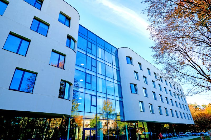 Алюмінієві фасади виконанні в профільній системі Reynaers CW- 50 HI, вікна - Reynaers Masterline 8 HІ з прихованими петлями. Особливістю архітектури проєкту є радіусні вікна та радіусні світлопрозорі фасади на кутах будівлі з гнутими склопакетами