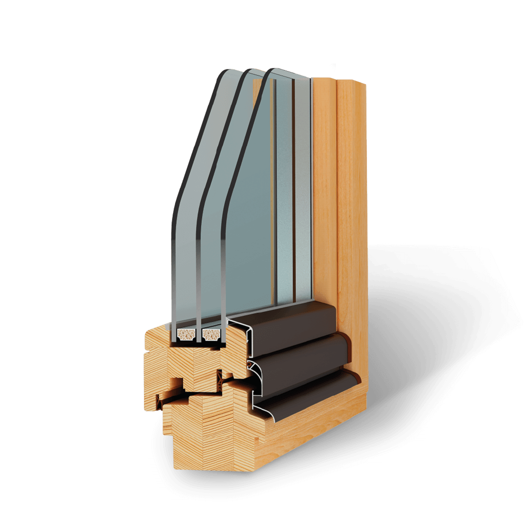 Сосновий зрощений дерев’яний брус, система “Термоплюс-78”, лакофарбове покриття Adler, колір Горіх (татарук). Склопакети товщиною 42мм., мультифункційні, теплі дистанційні рамки