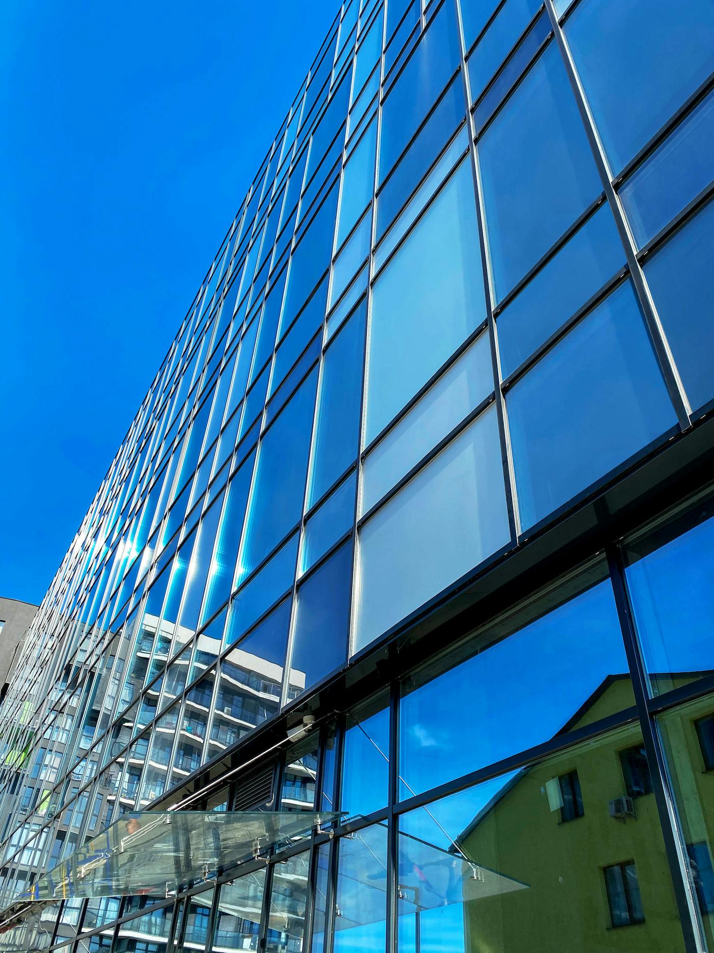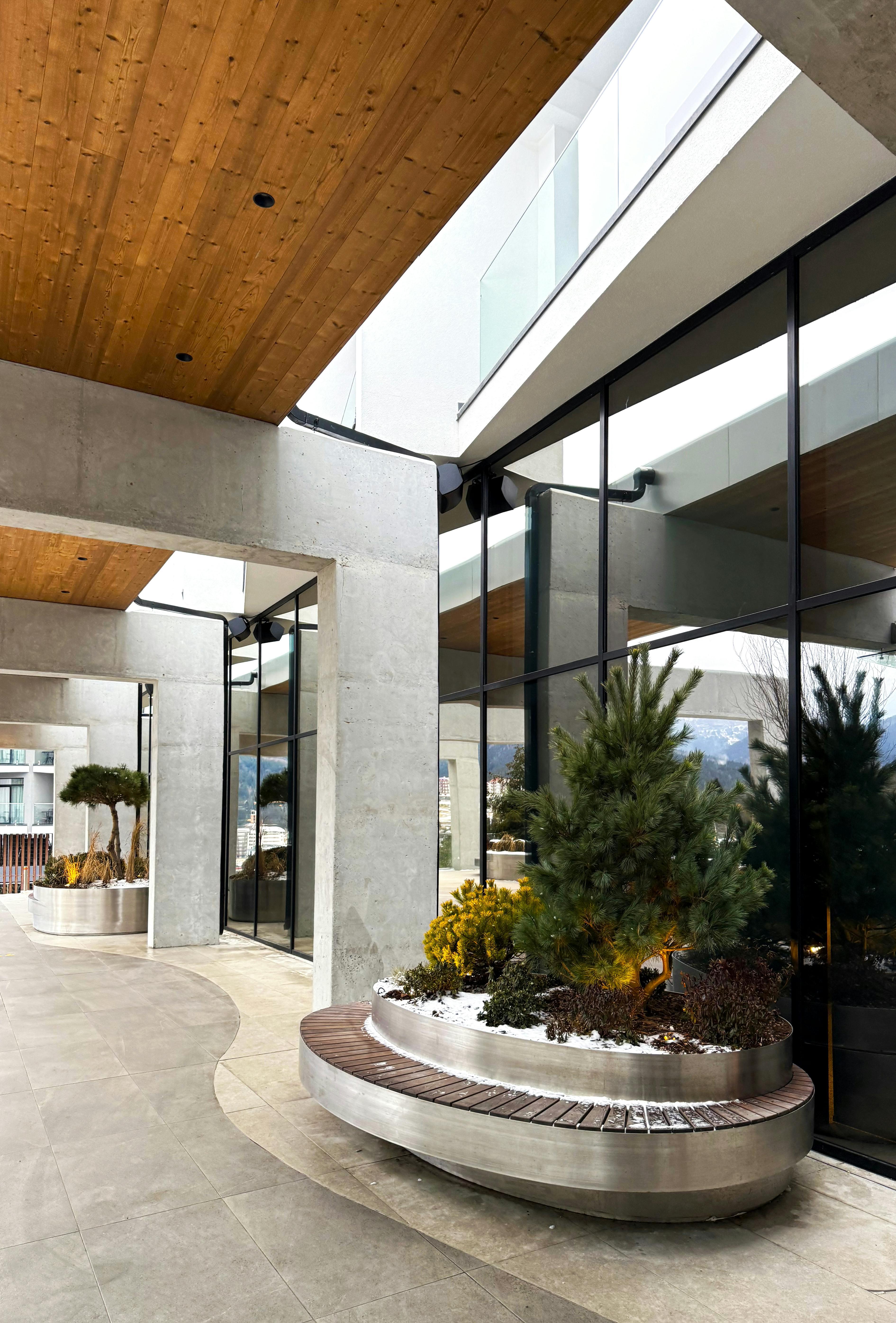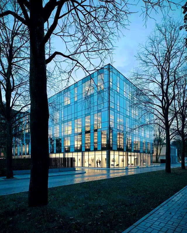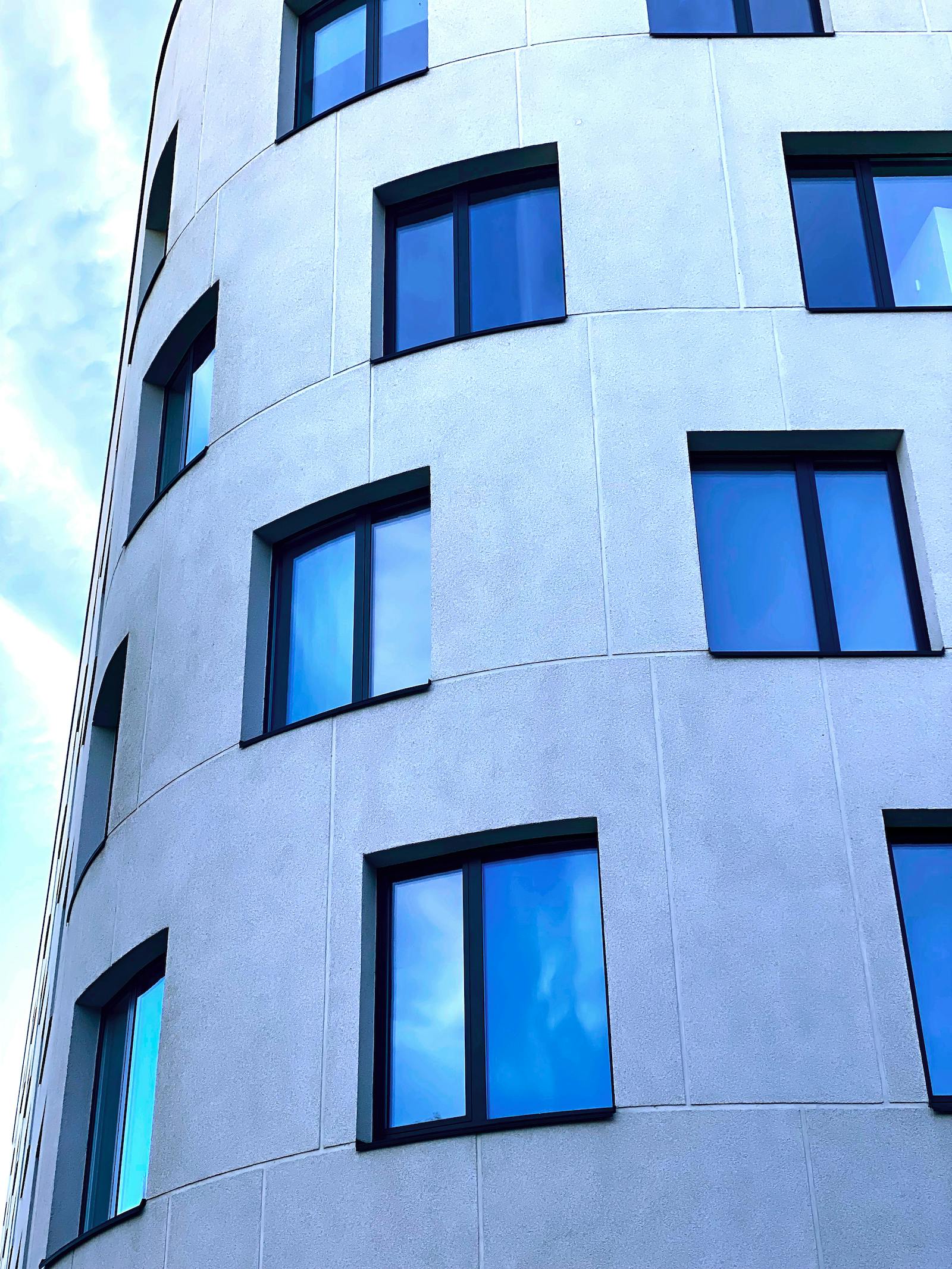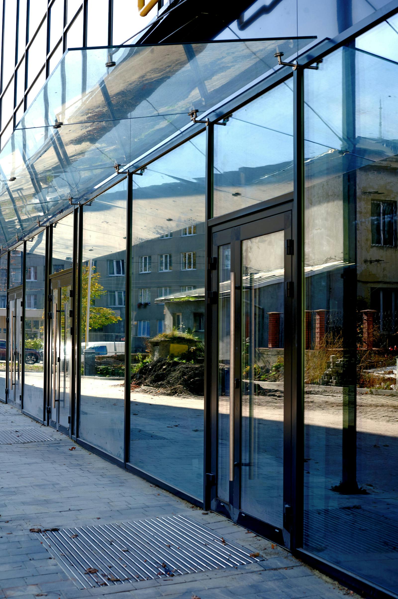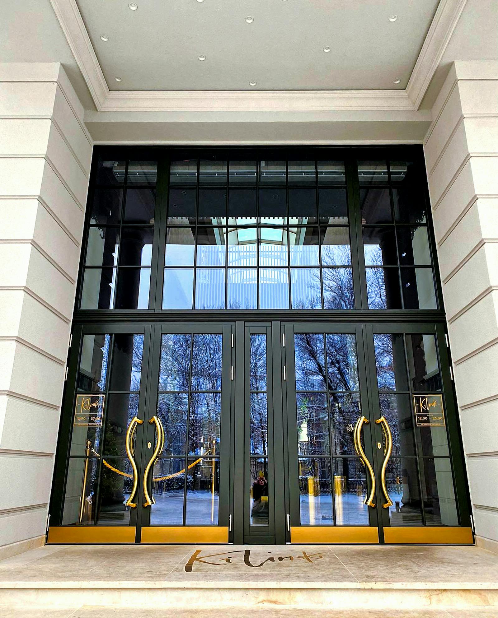 Алюмінієві фасади виконанні в профільній системі Reynaers CW- 50 HI, вікна - Reynaers Masterline 8 HІ з прихованими петлями. Особливістю архітектури проєкту є радіусні вікна та радіусні світлопрозорі фасади на кутах будівлі з гнутими склопакетами