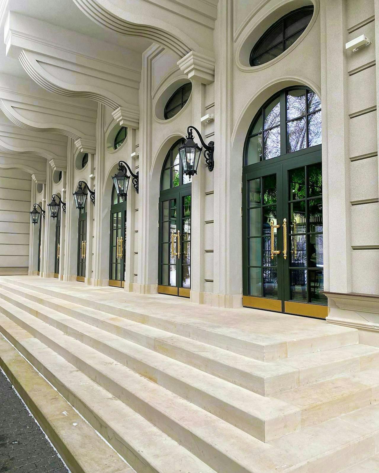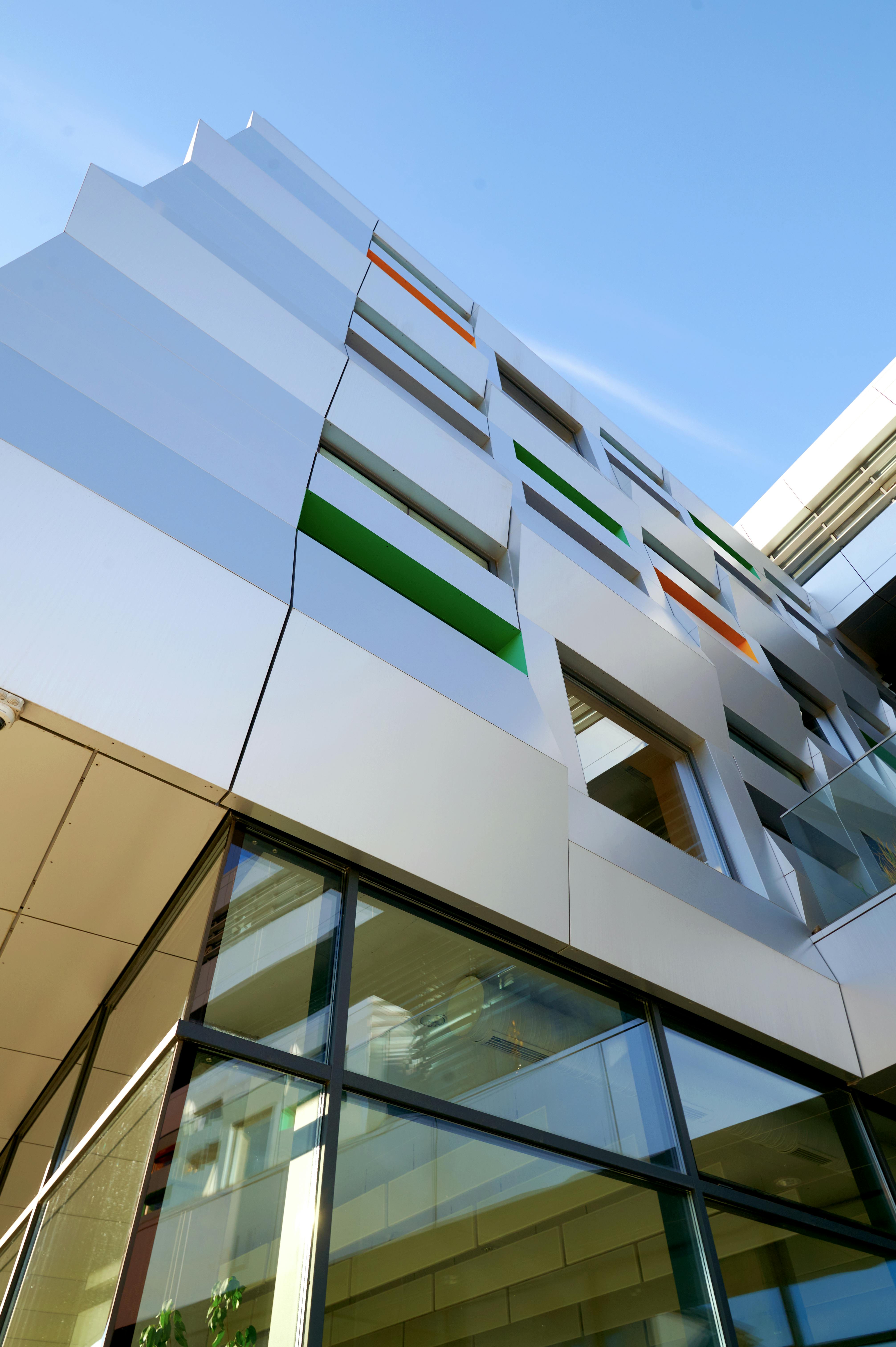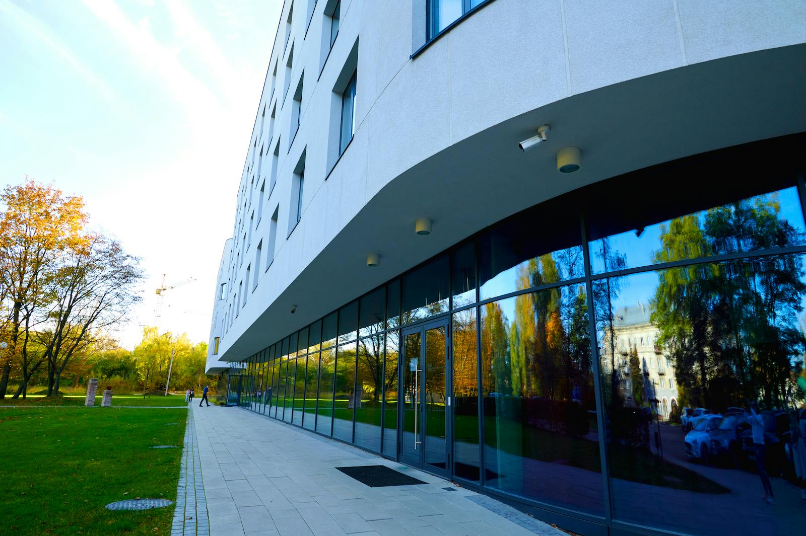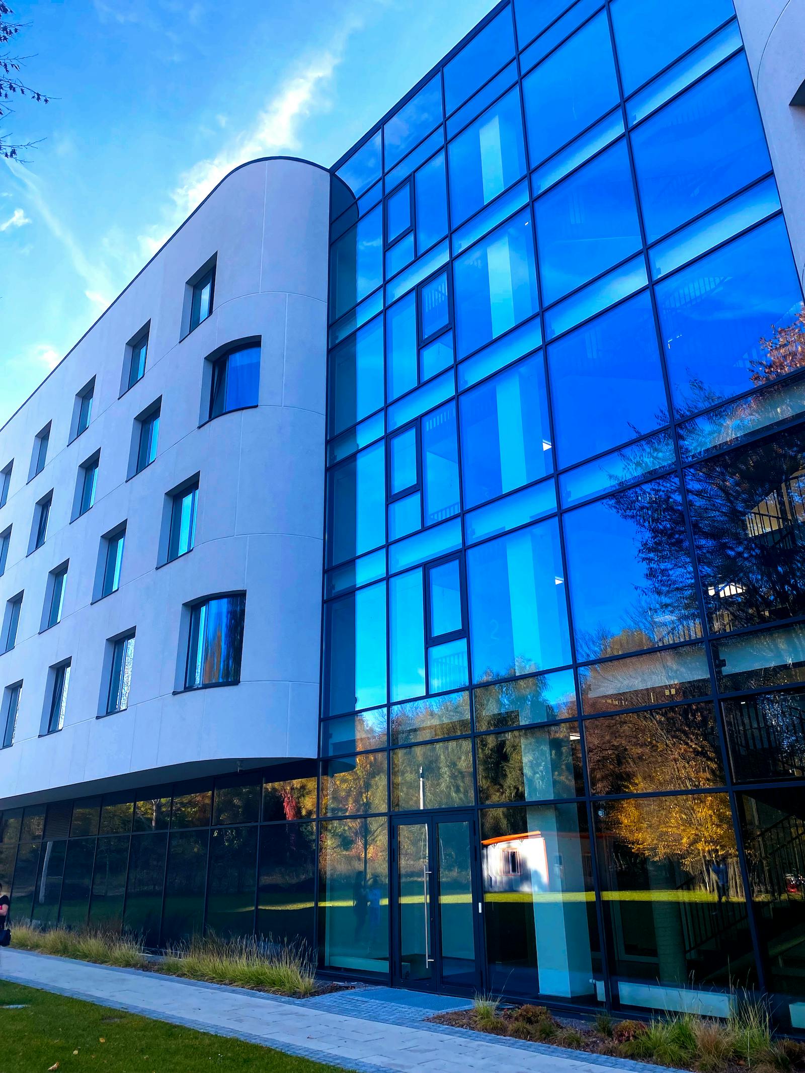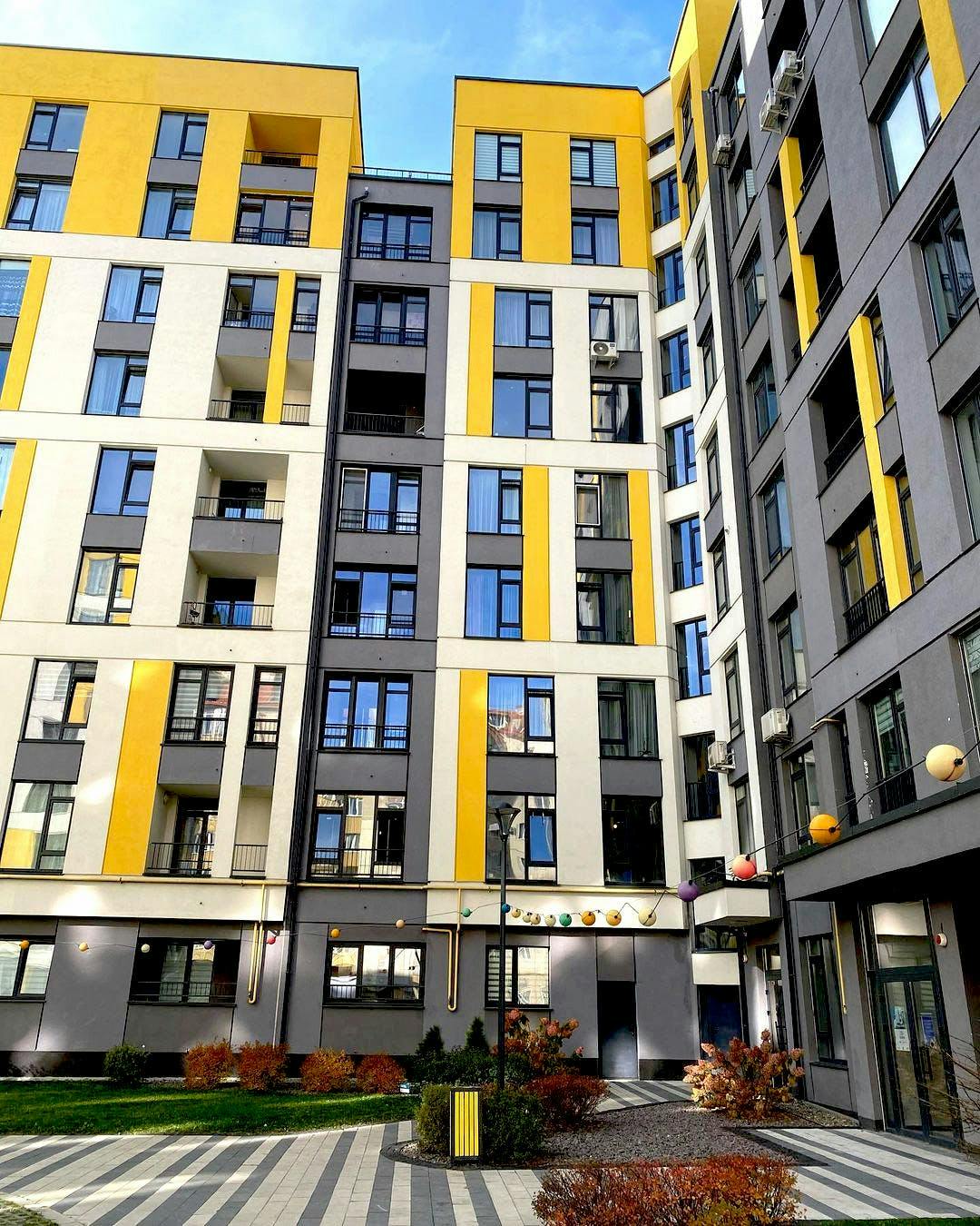 Алюмінієві фасади виконанні в профільній системі Reynaers CW- 50 HI, вікна - Reynaers Masterline 8 HІ з прихованими петлями. Особливістю архітектури проєкту є радіусні вікна та радіусні світлопрозорі фасади на кутах будівлі з гнутими склопакетами