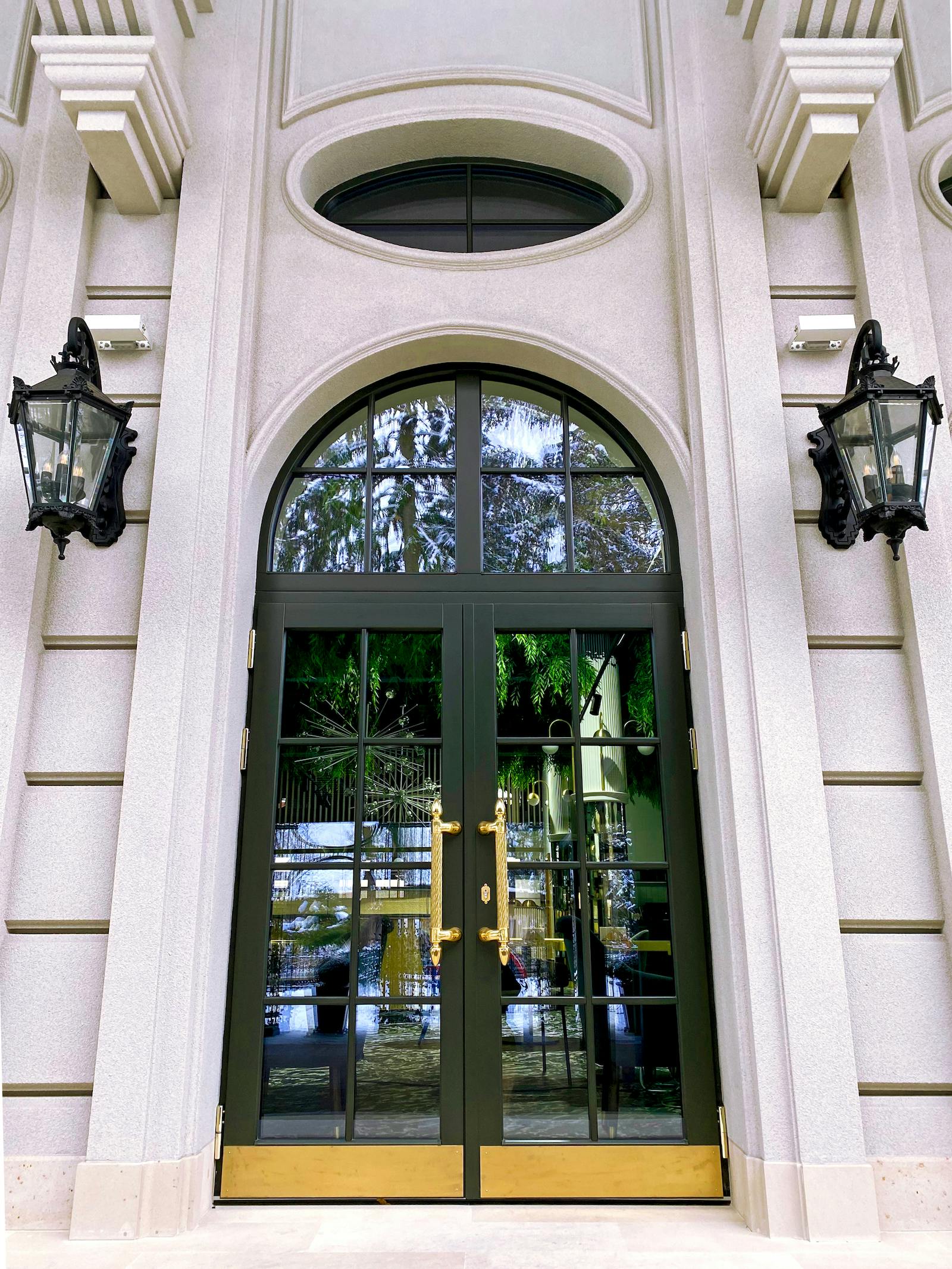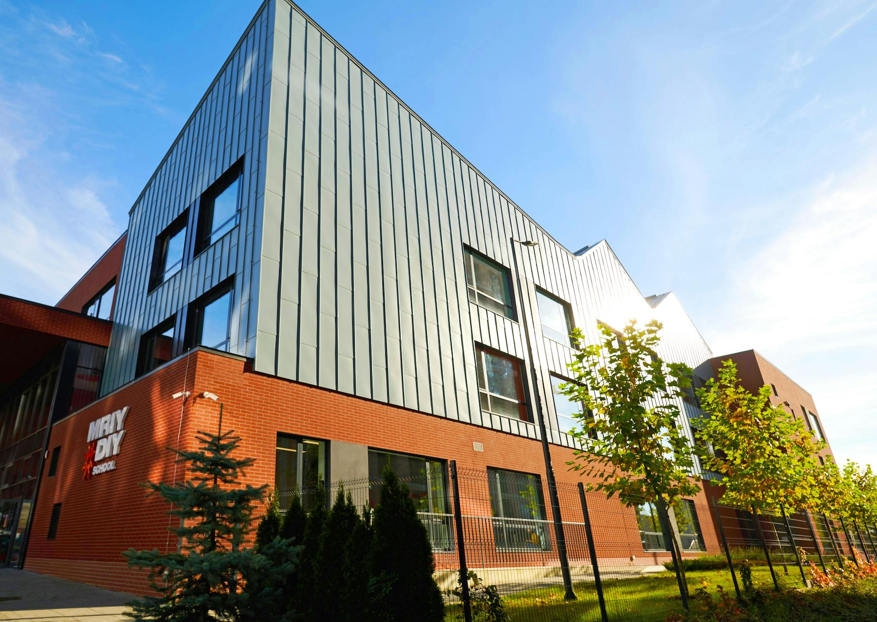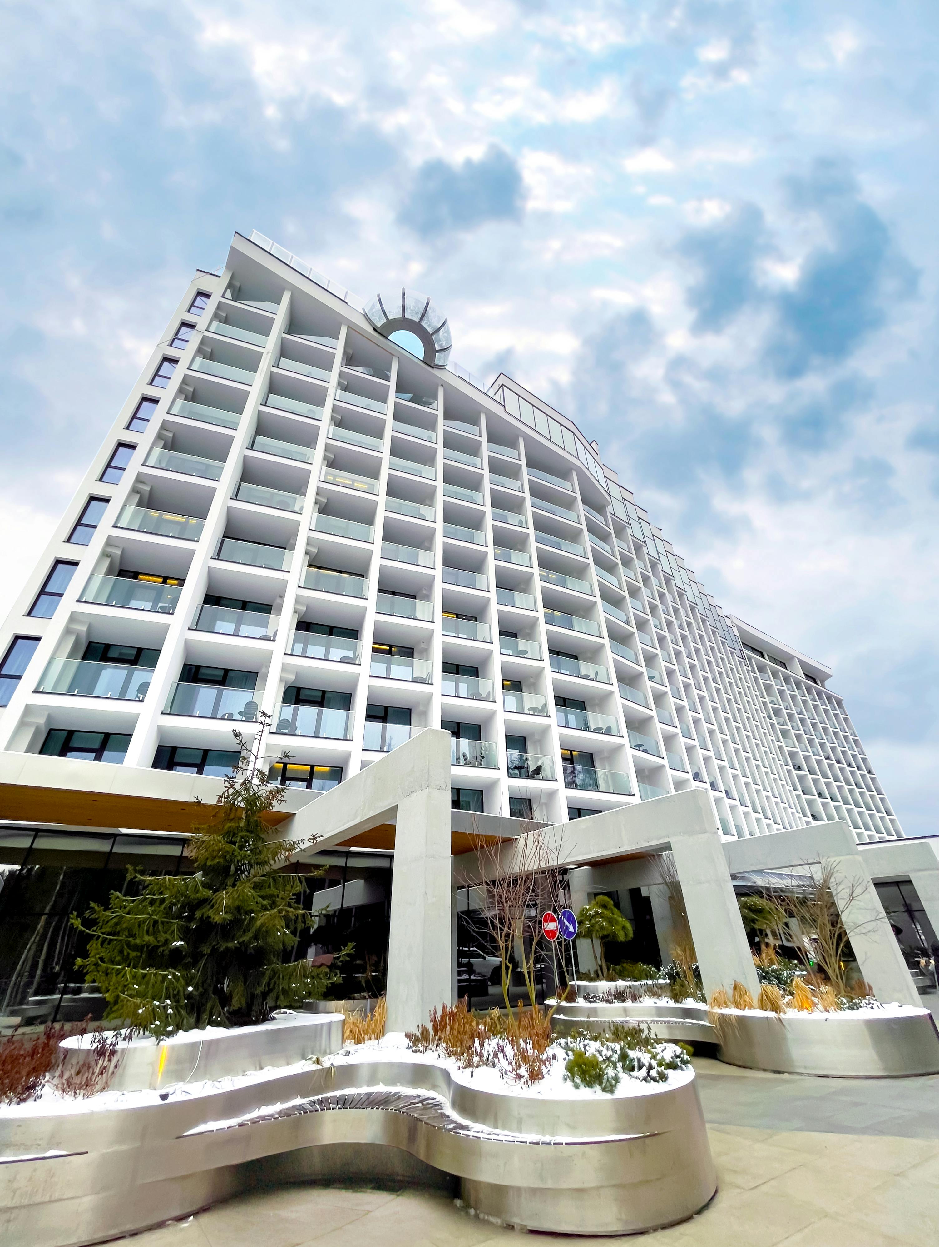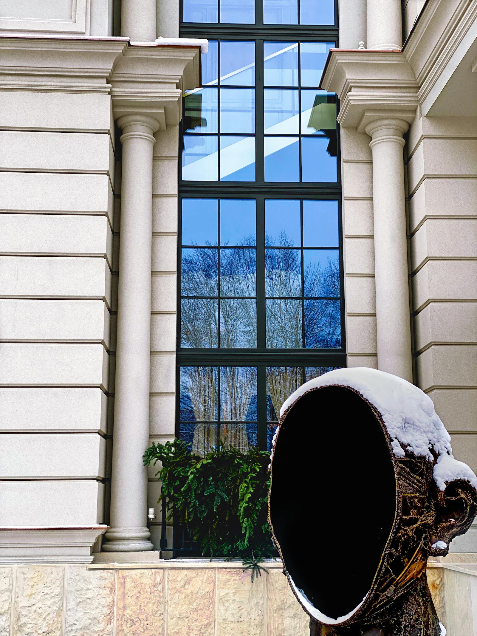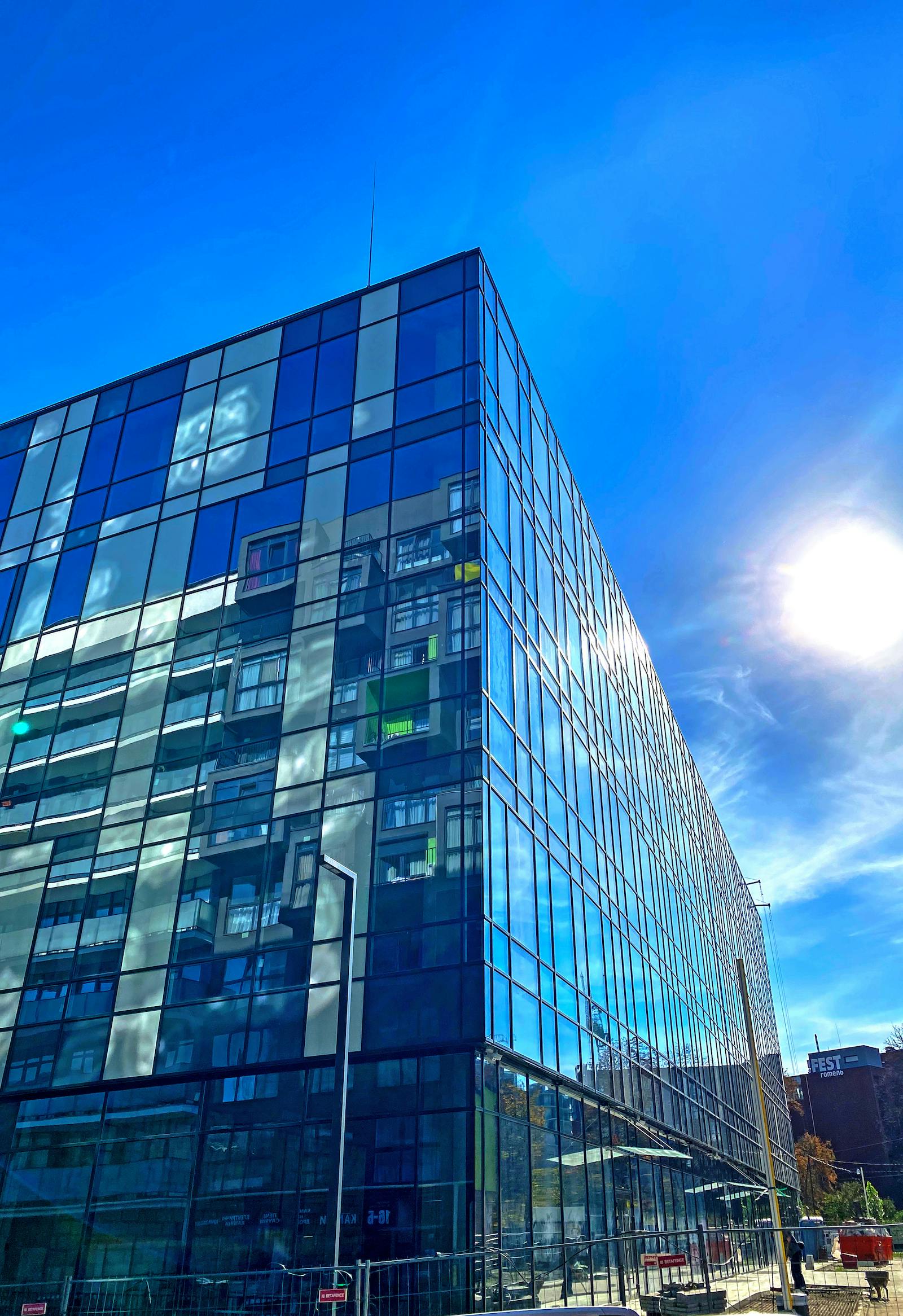 Алюмінієві фасади виконанні в профільній системі Reynaers CW- 50 HI, вікна - Reynaers Masterline 8 HІ з прихованими петлями. Особливістю архітектури проєкту є радіусні вікна та радіусні світлопрозорі фасади на кутах будівлі з гнутими склопакетами