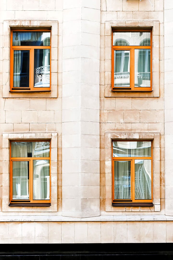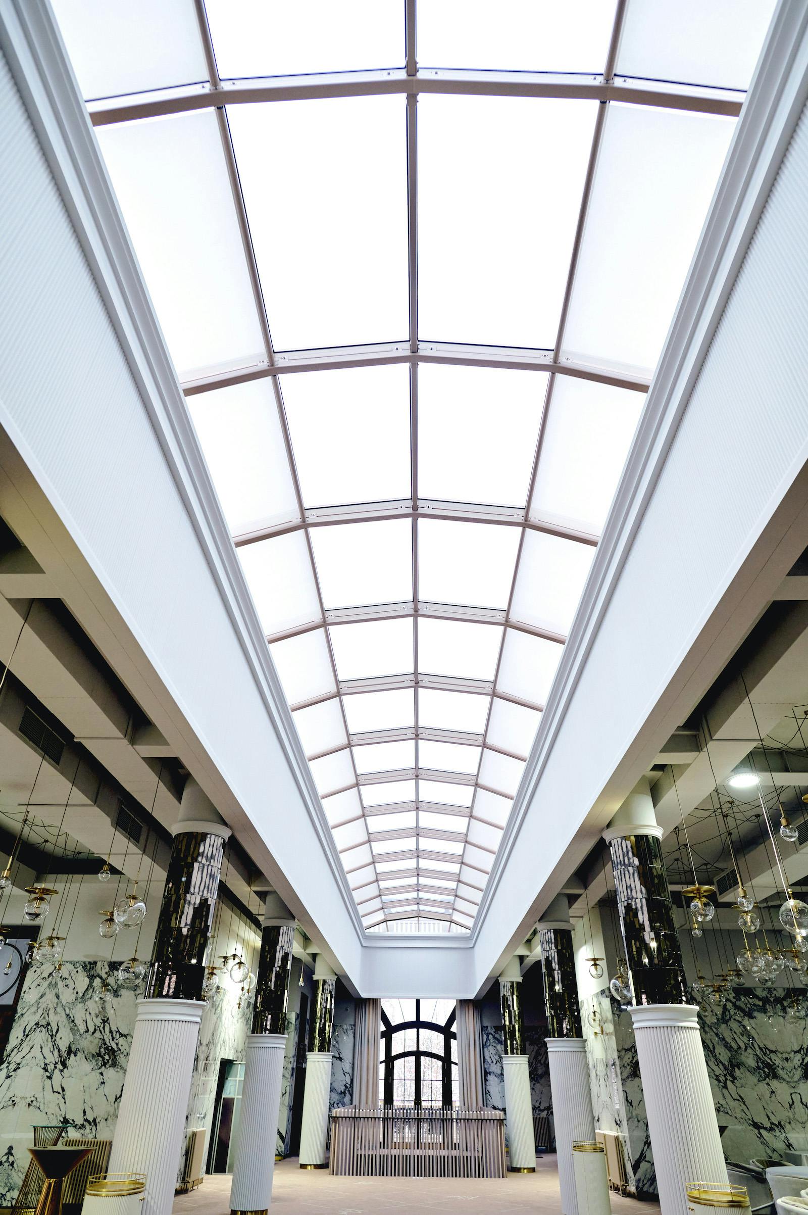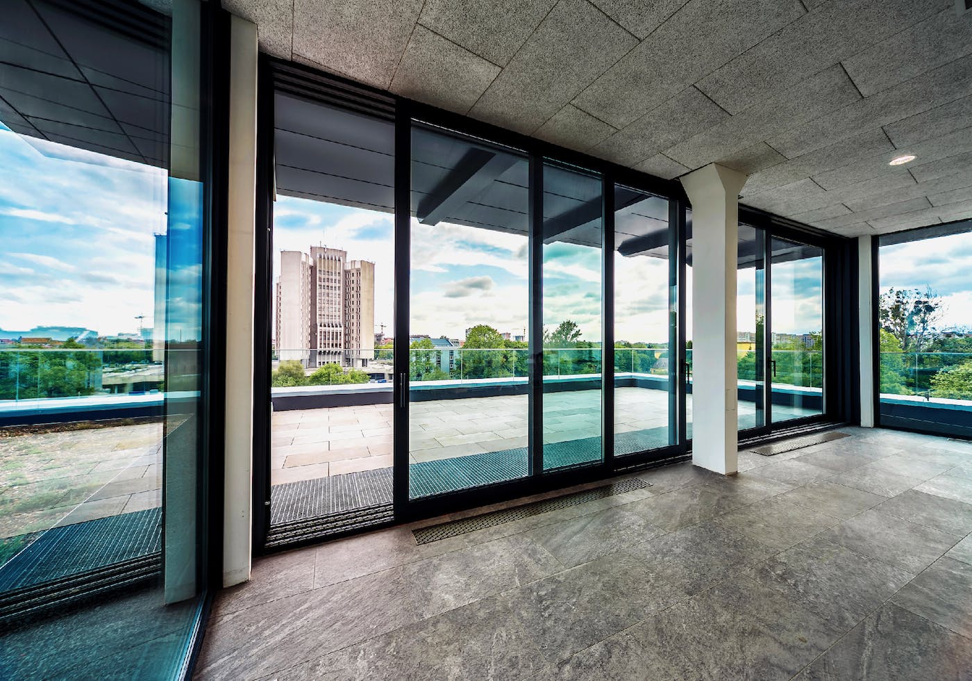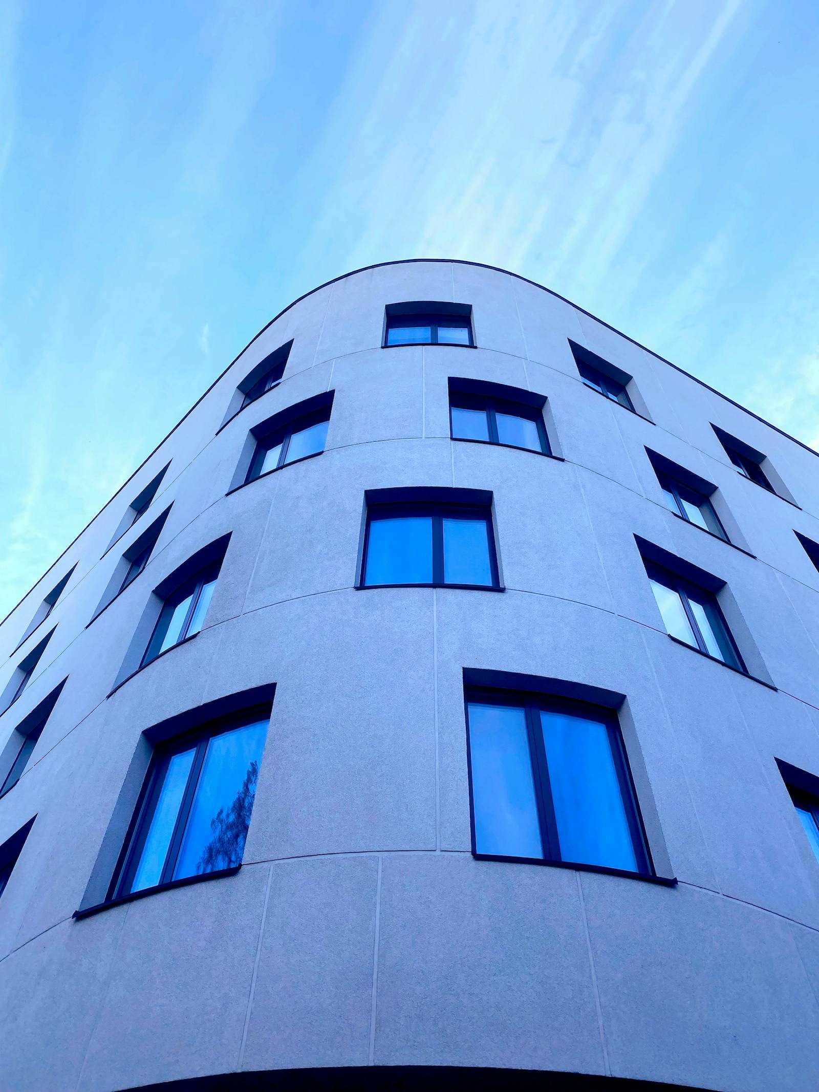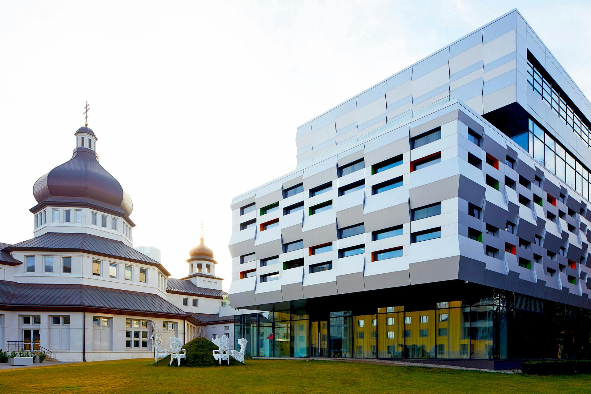 Алюмінієві фасади виконанні в профільній системі Reynaers CW- 50 HI, вікна - Reynaers Masterline 8 HІ з прихованими петлями. Особливістю архітектури проєкту є радіусні вікна та радіусні світлопрозорі фасади на кутах будівлі з гнутими склопакетами