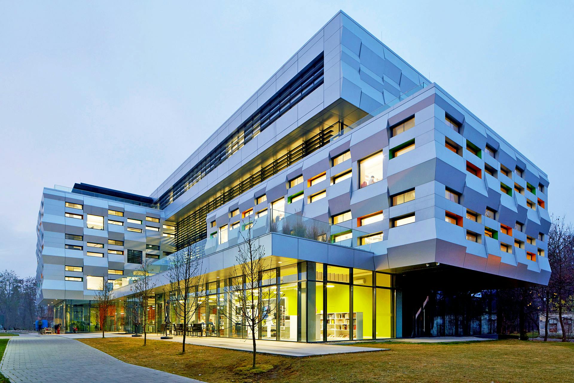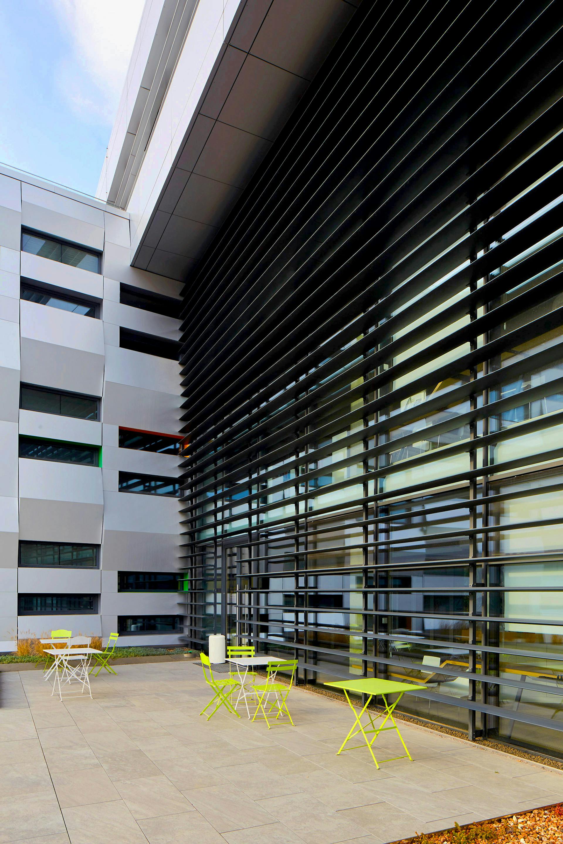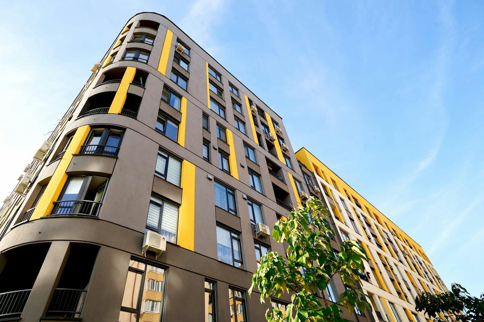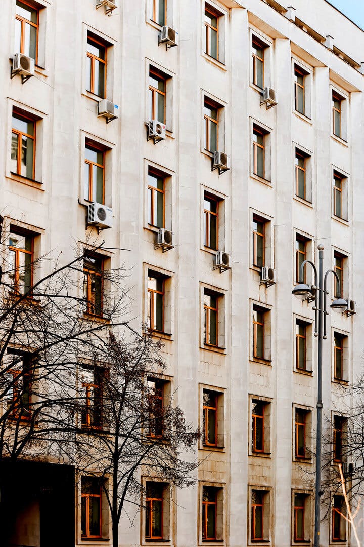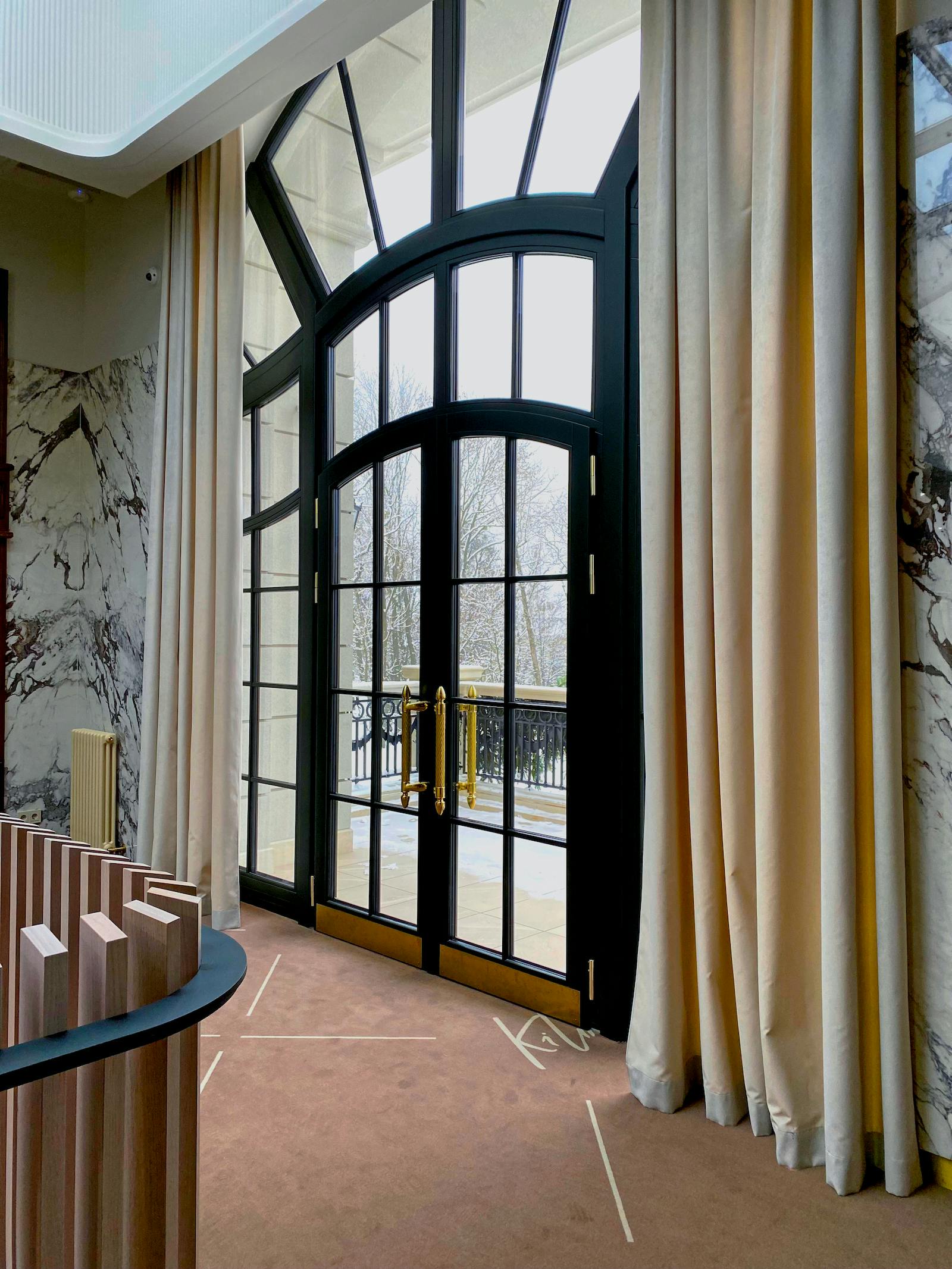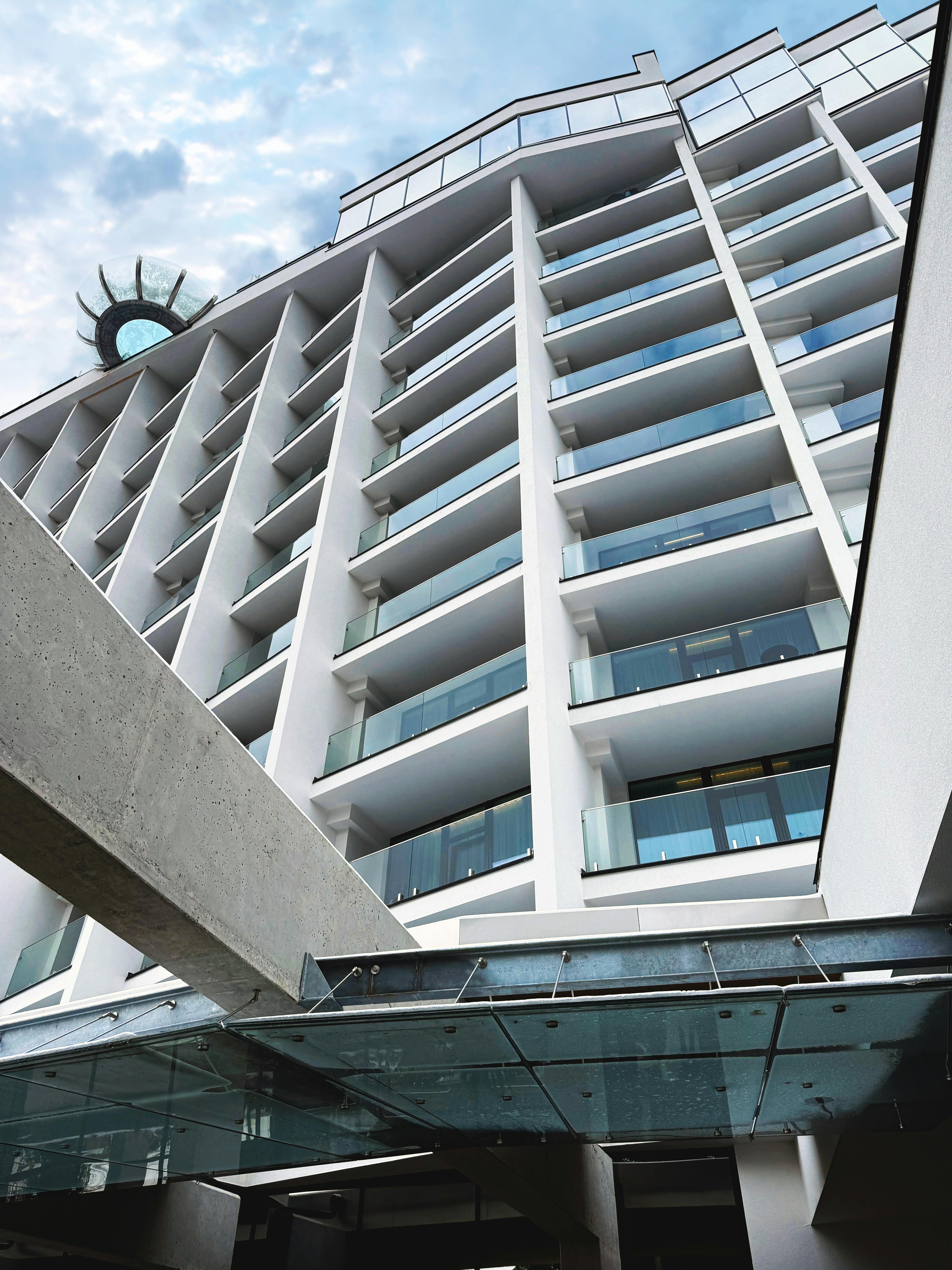 Алюмінієві фасади виконанні в профільній системі Reynaers CW- 50 HI, вікна - Reynaers Masterline 8 HІ з прихованими петлями. Особливістю архітектури проєкту є радіусні вікна та радіусні світлопрозорі фасади на кутах будівлі з гнутими склопакетами