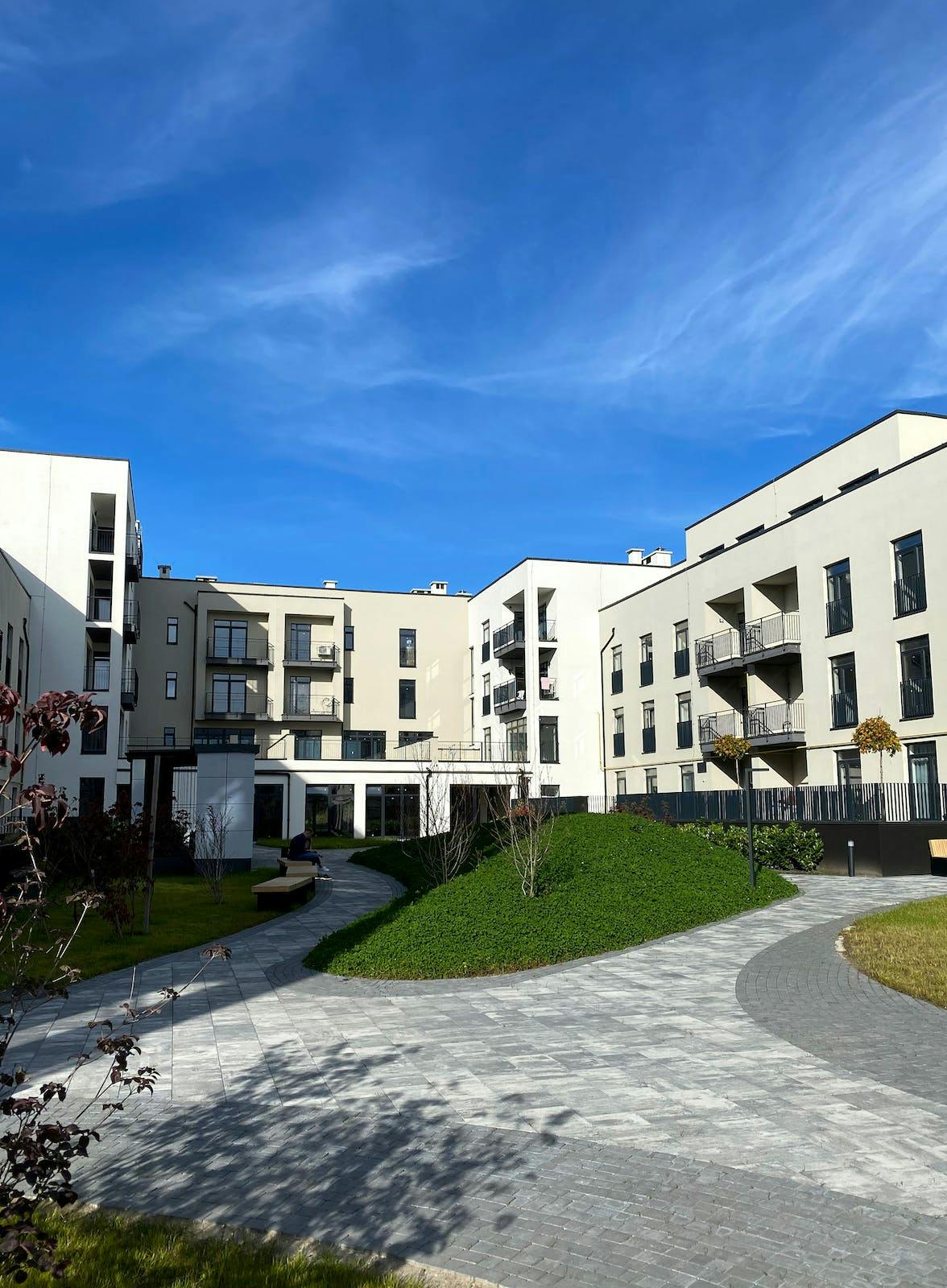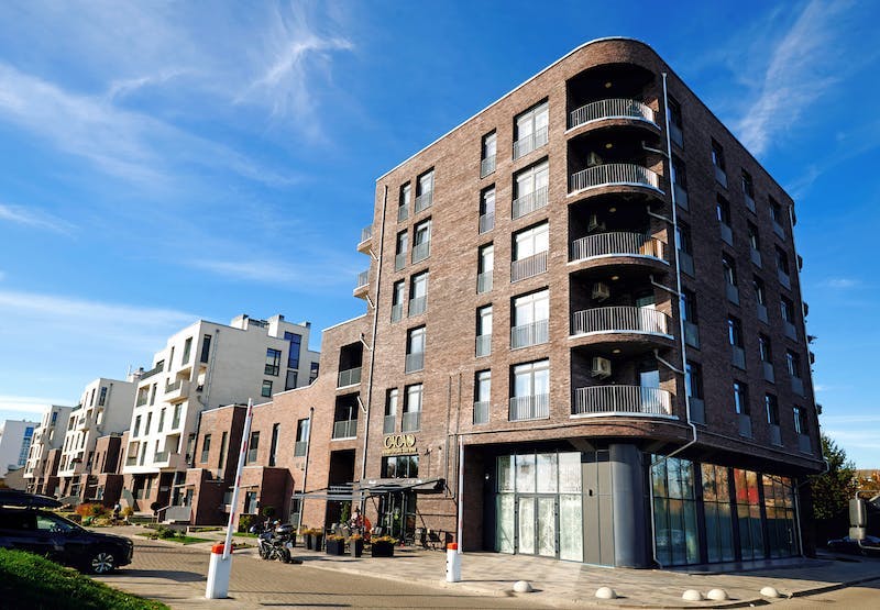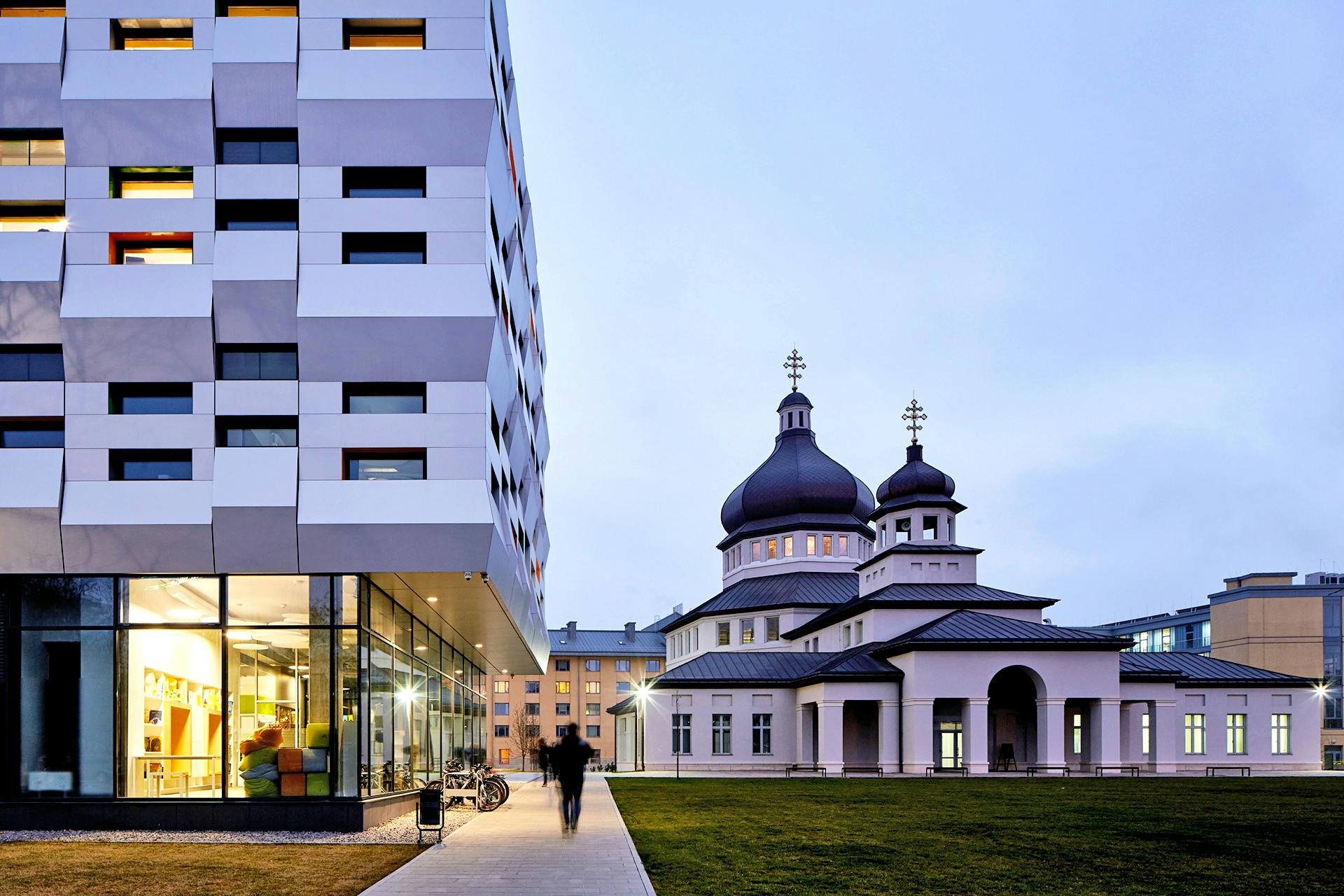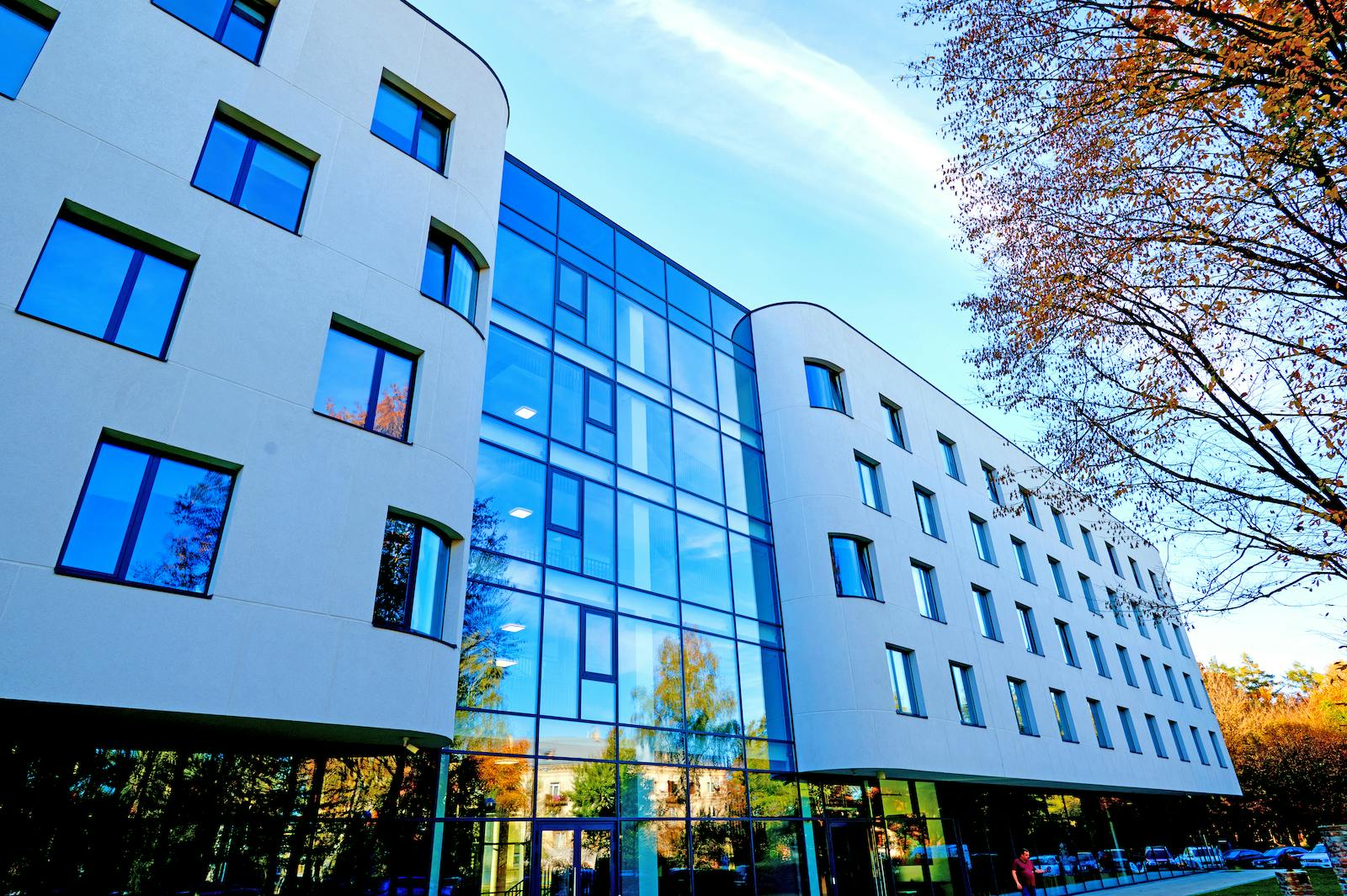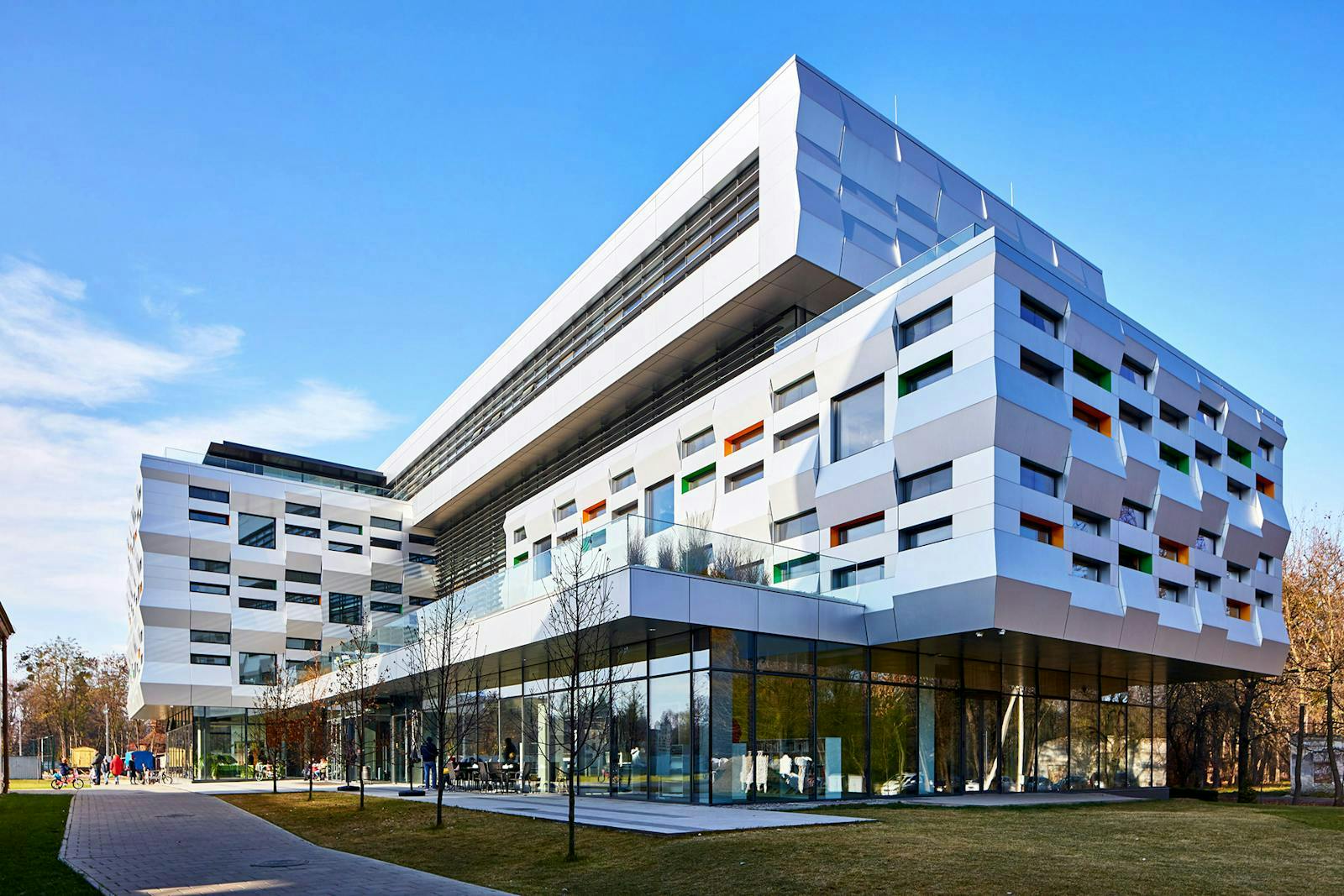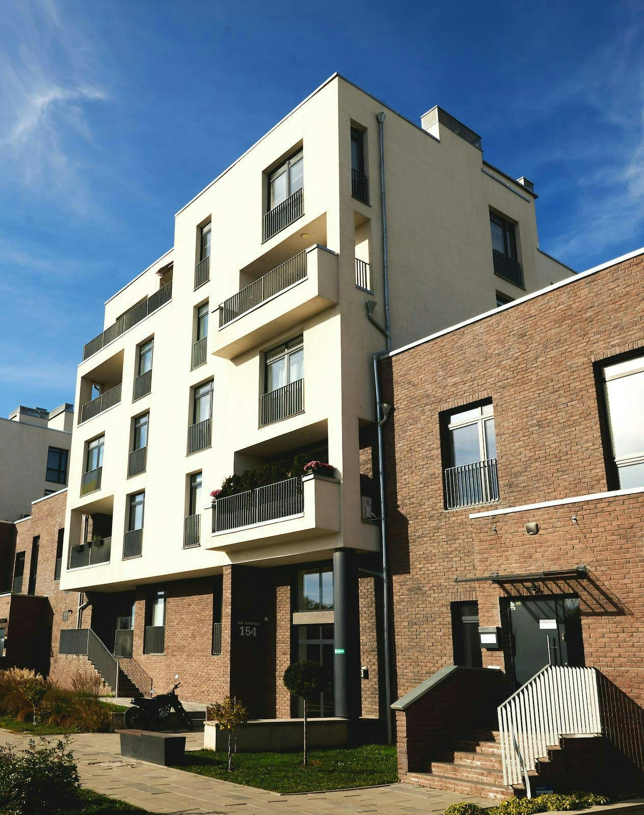 Алюмінієві фасади виконанні в профільній системі Reynaers CW- 50 HI, вікна - Reynaers Masterline 8 HІ з прихованими петлями. Особливістю архітектури проєкту є радіусні вікна та радіусні світлопрозорі фасади на кутах будівлі з гнутими склопакетами