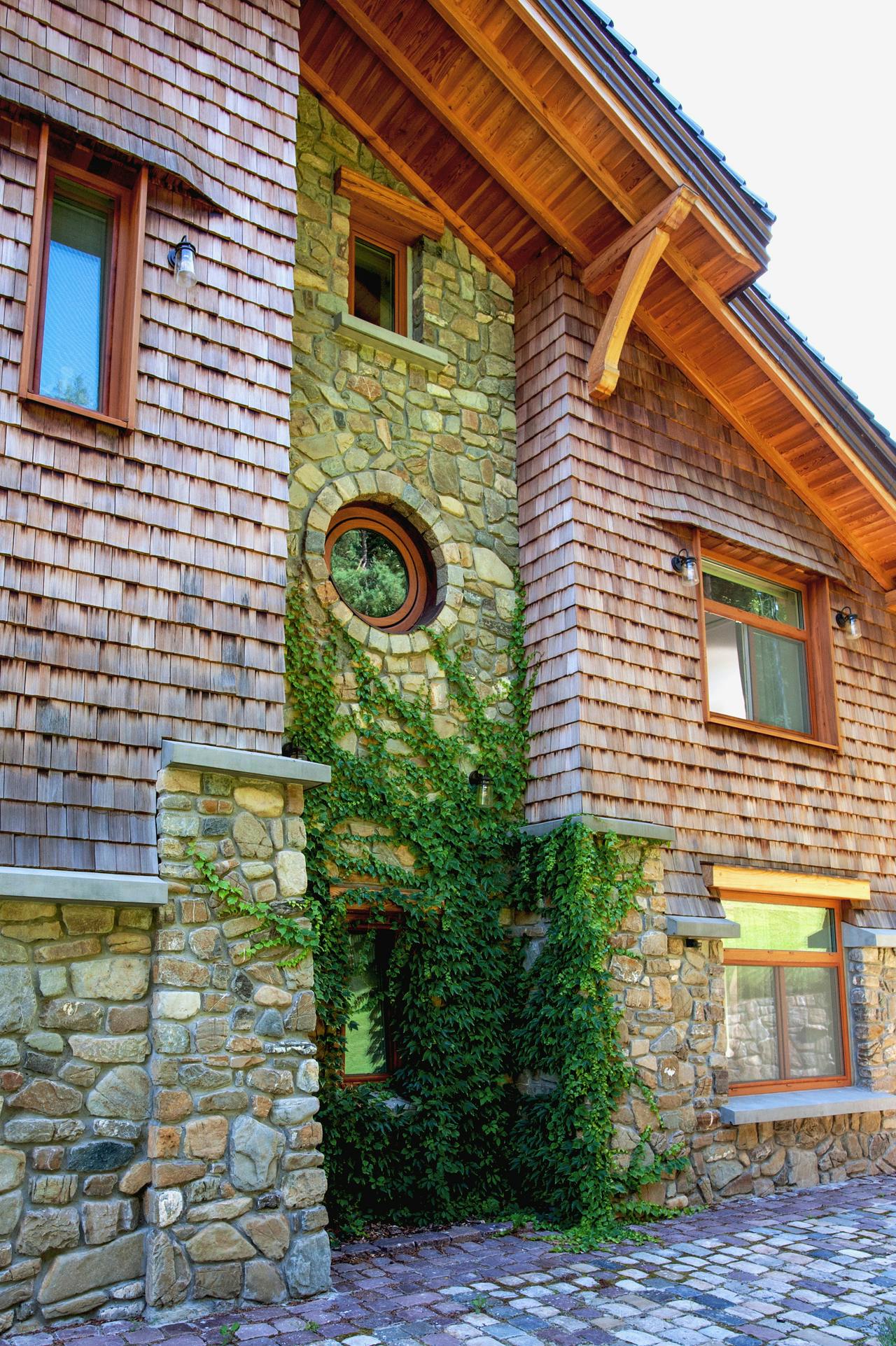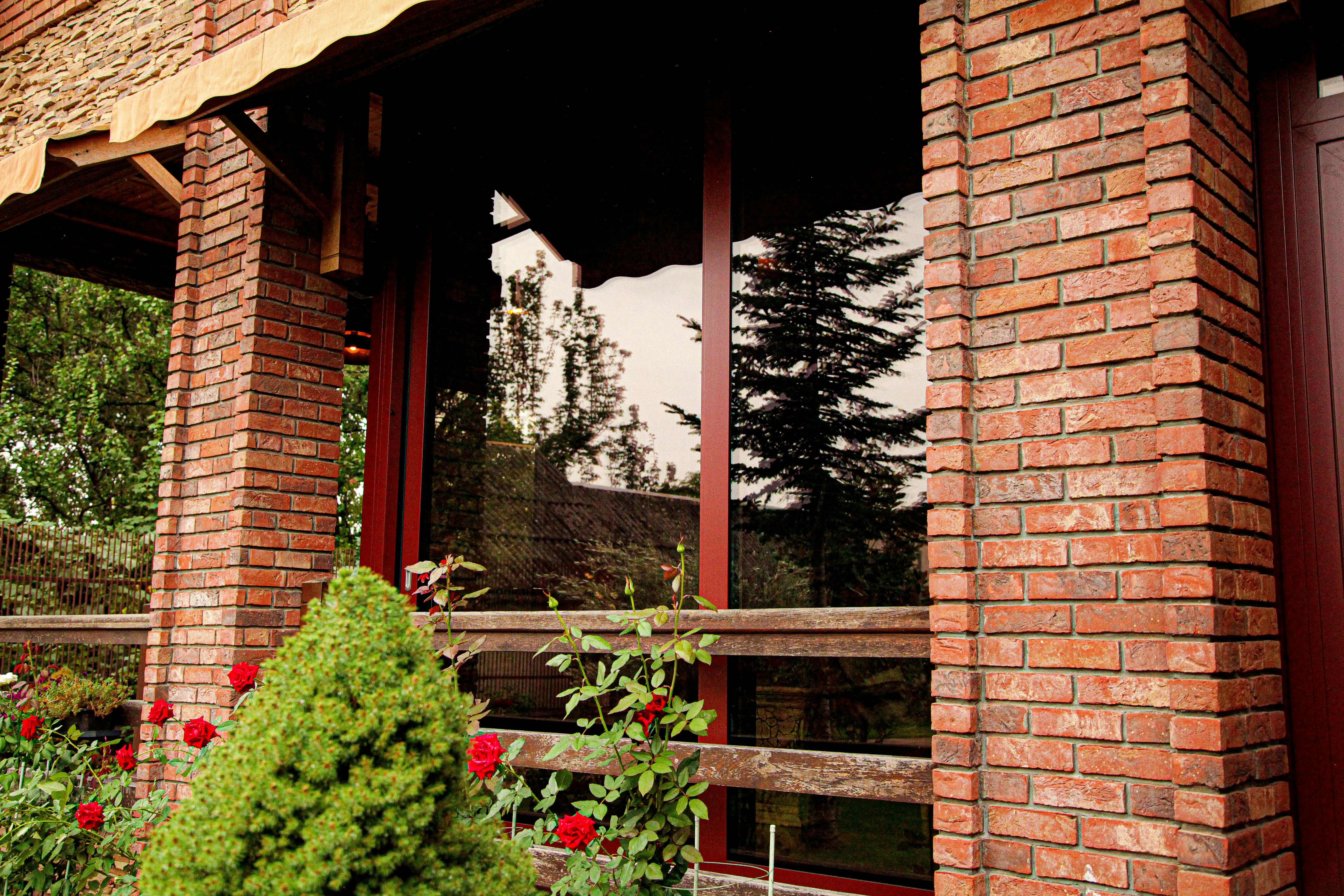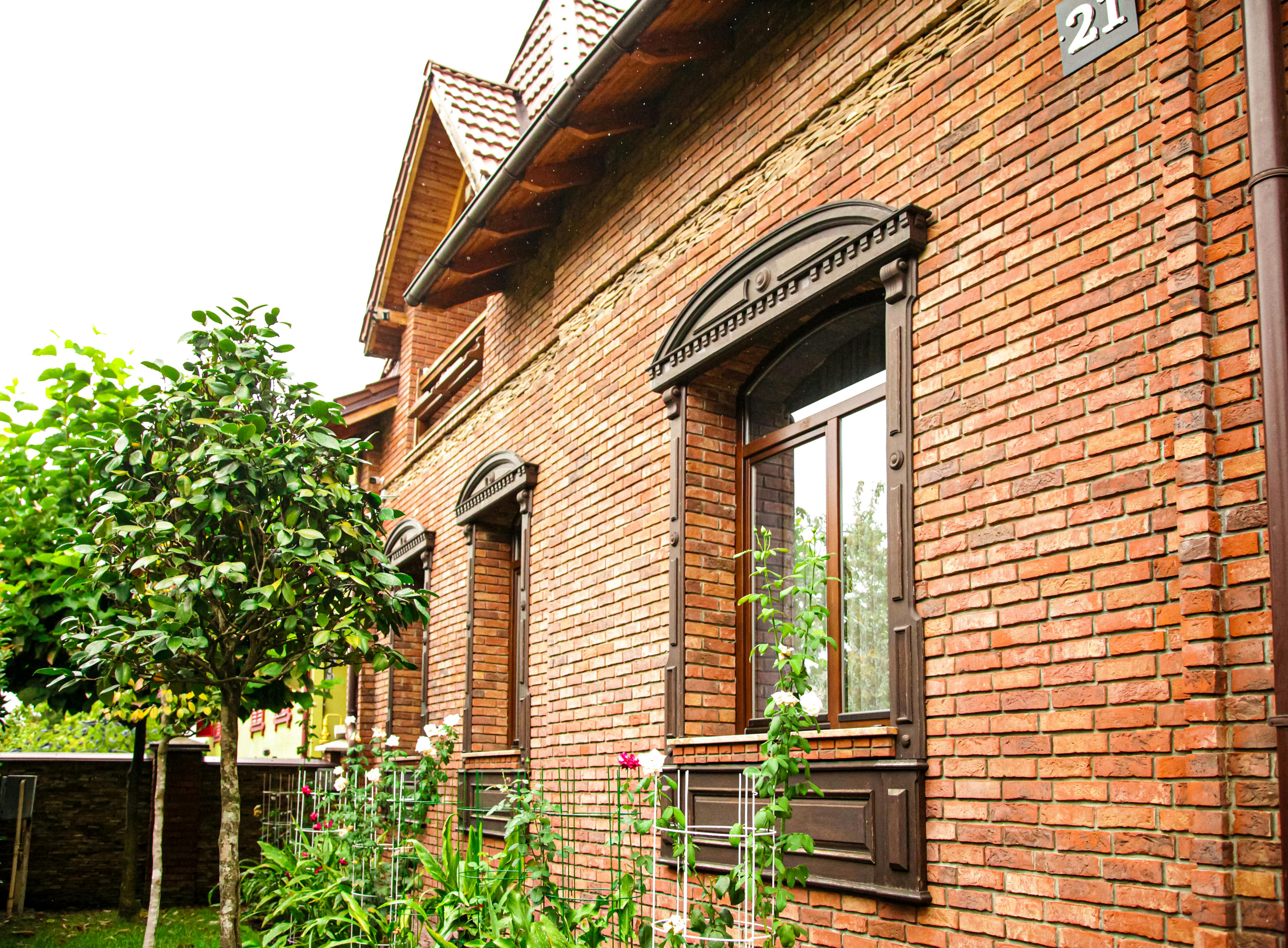Дубовий зрощений дерев’яний брус, система “Passive-92”, лакофарбове покриття Adler, колір “Smotruch 1898”, алюмінієва накладка системи Gemini Retro, колір Тік, склопакети товщиною 48мм., мультифункційні, гартовані