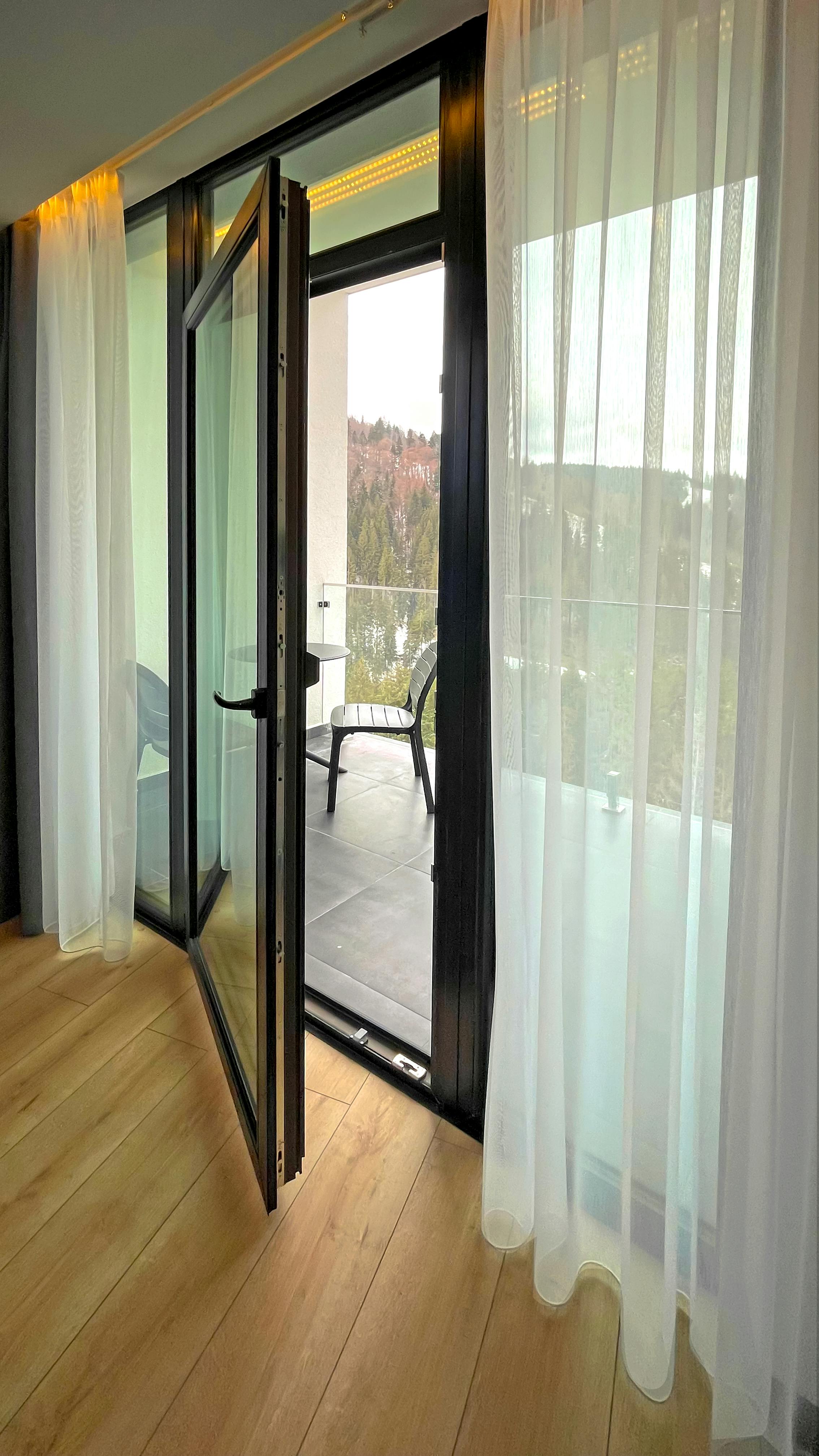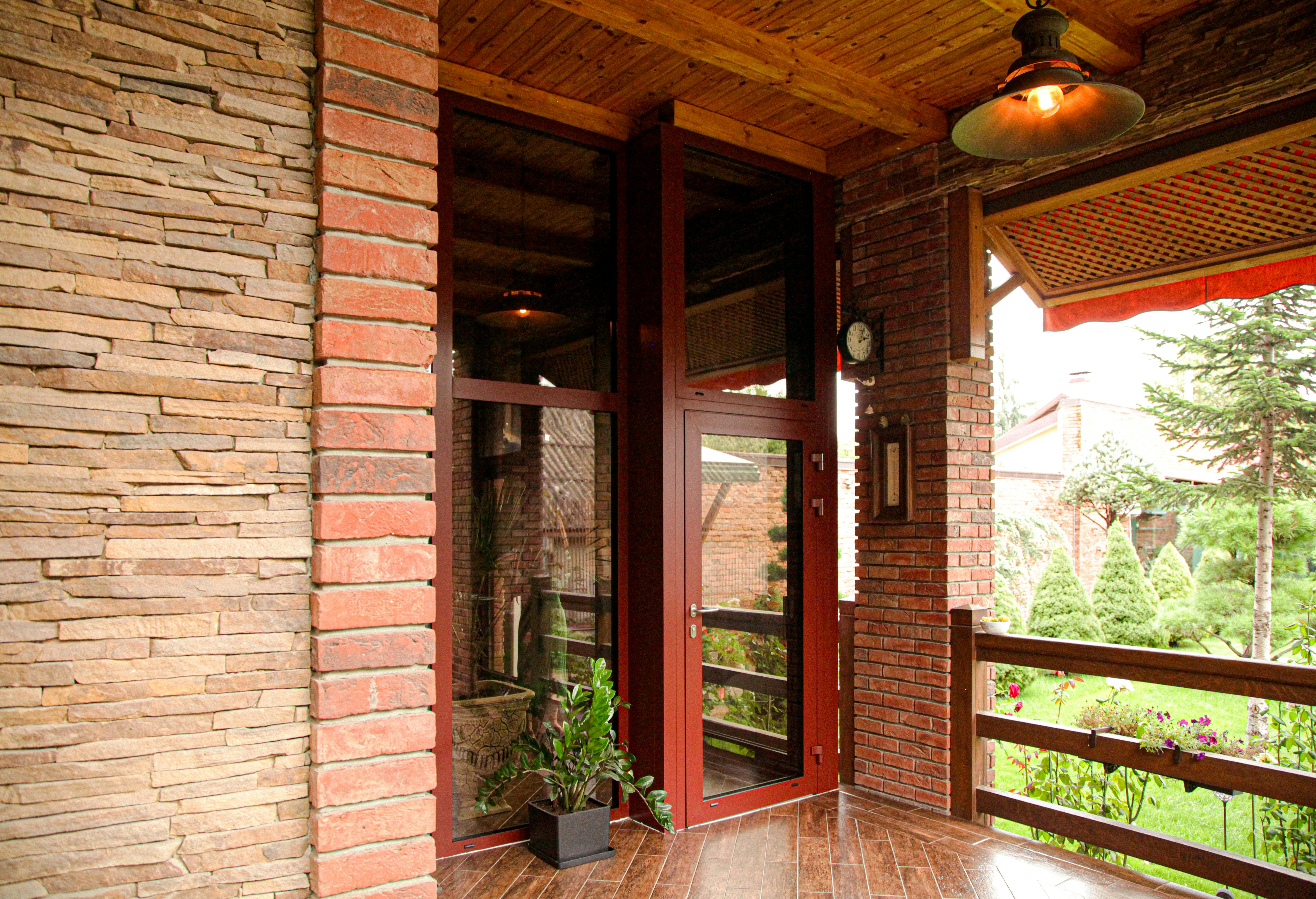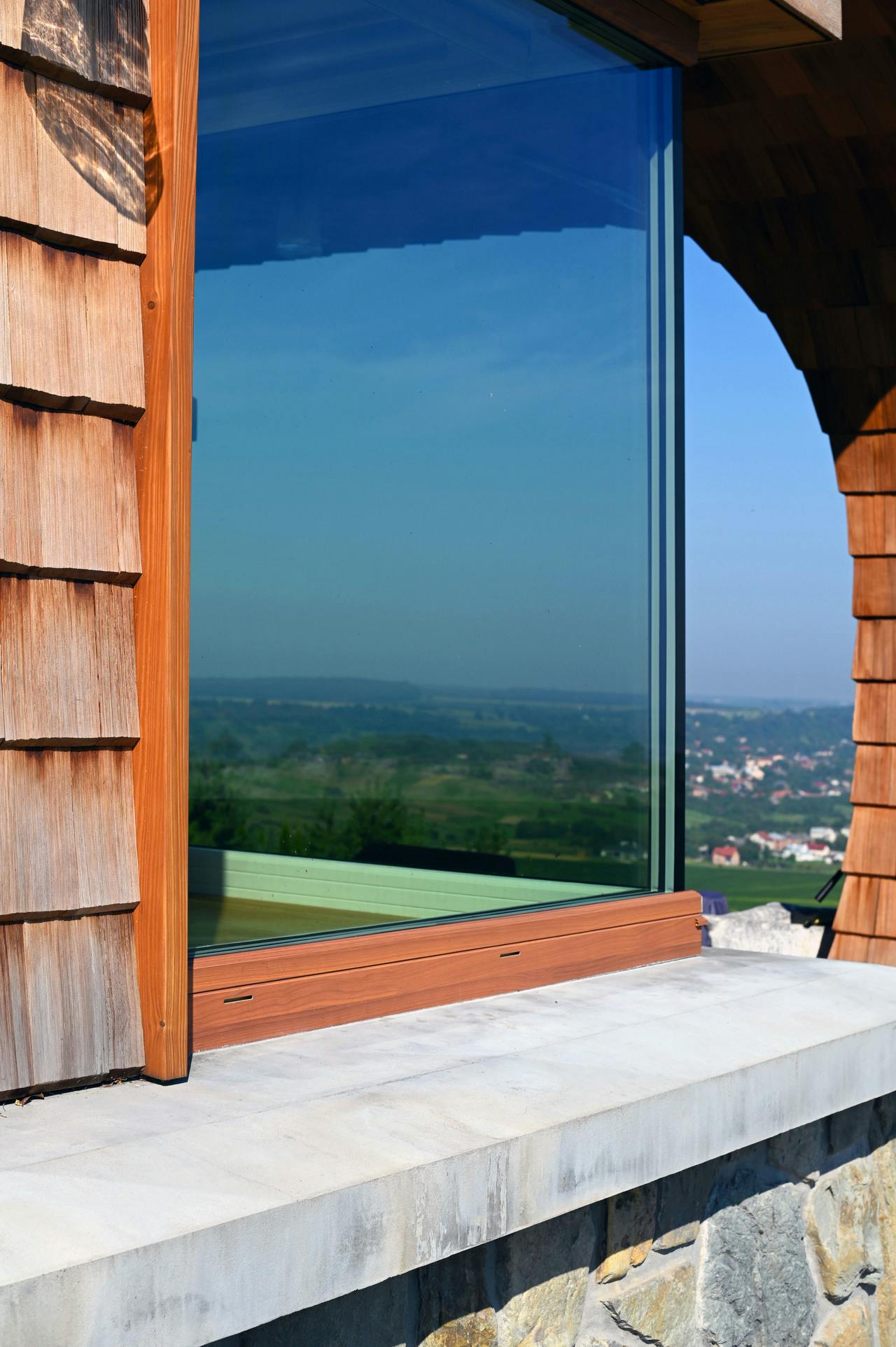 Алюмінієва профільна система Reynaers MasterLine 8 HI разом із розсувною системою CP 155-LS. Також встановлені вікна та двері з соснового дерев’яного бруса, система “Термоплюс-78”
