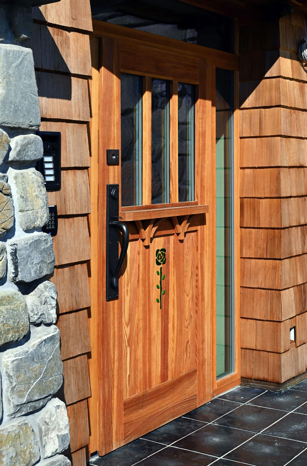 Сосновий дерев’яний брус, система “Термоплюс-78”, накладні віденські шпроси та захисні декоративні пластини з латуні. Екологічно чистий лак “Protor” від Adler, колір Ral 6015. Фурнітура Maco, замки - рейка від ключа, металеві дверні ручки з латуні