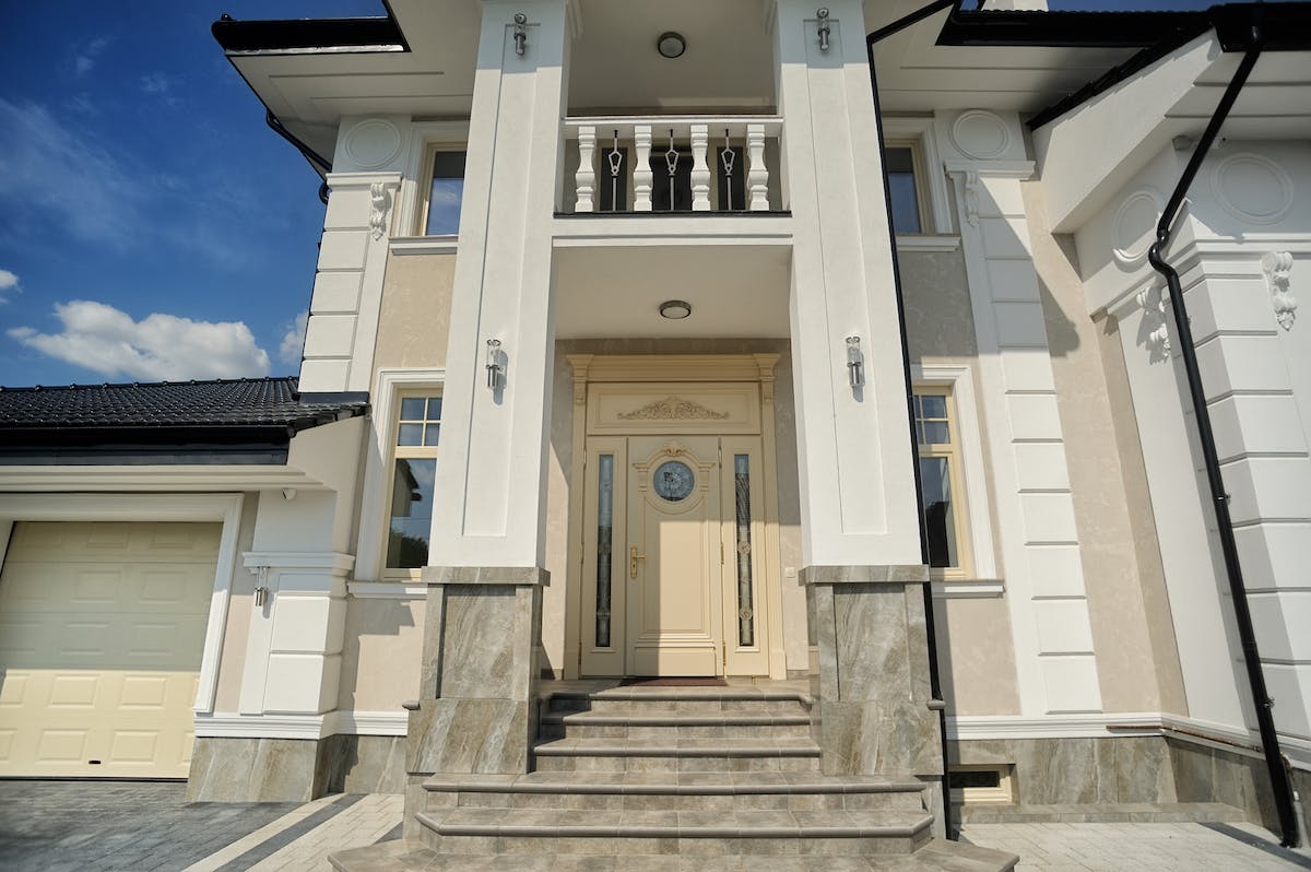 Дубовий дерев’яний брус, система “Passive-92”, лакофарбове покриття Adler, колір Ral 1015, склопакети товщиною 48мм., мультифункційні, шпрос дюплекс, фурнітура WinkHaus. Вхідна група замки GU Secury Automatic