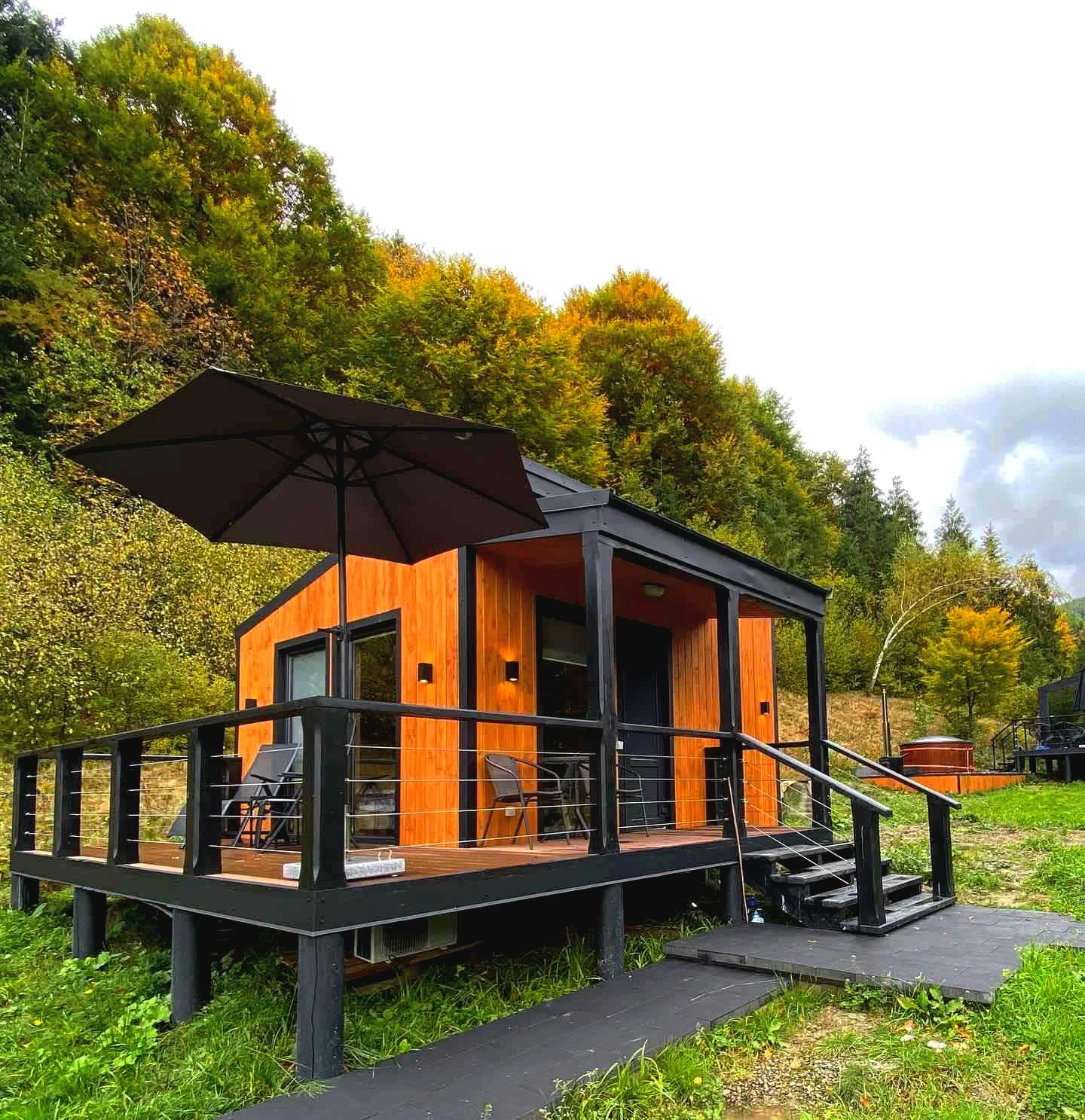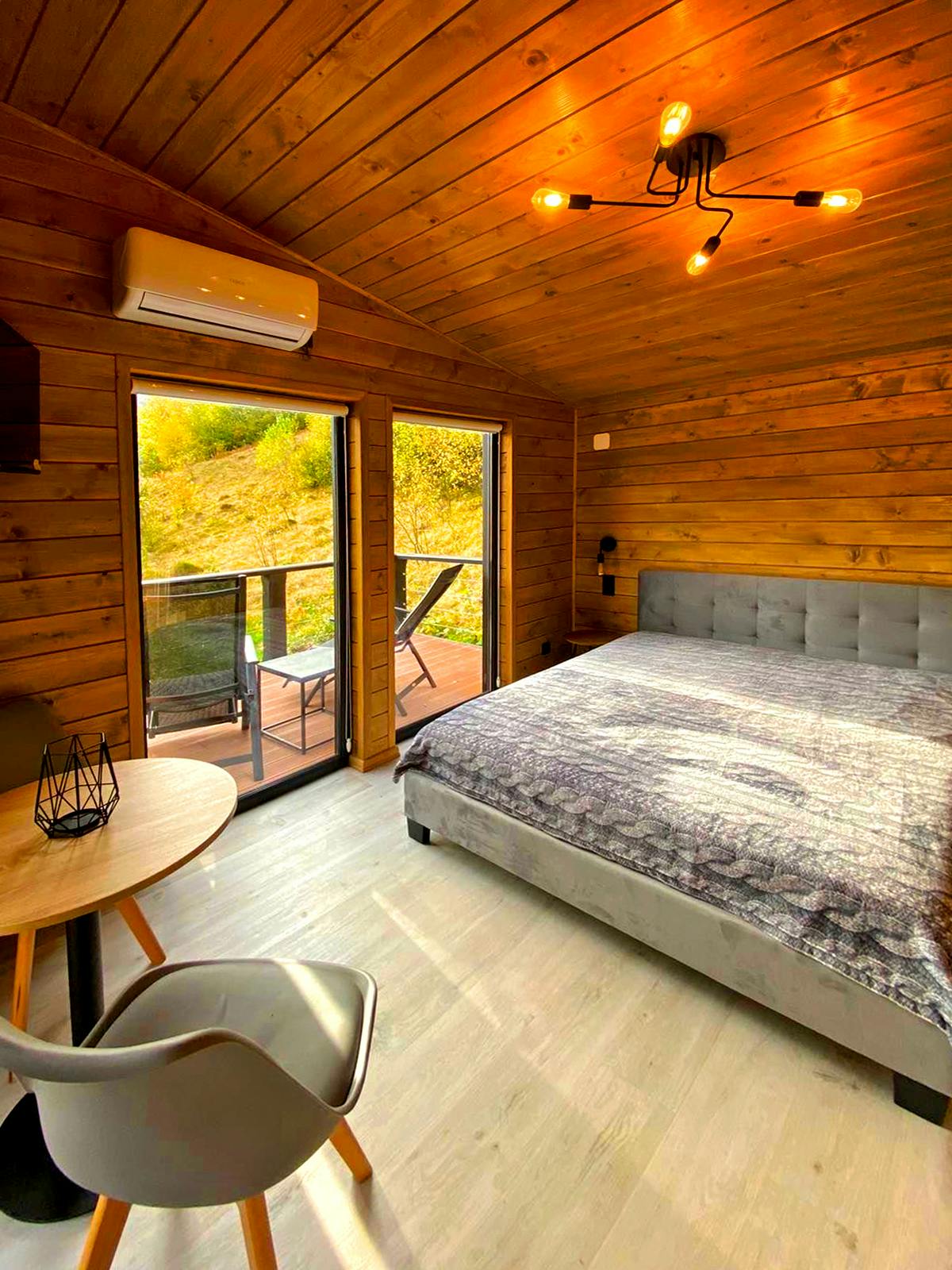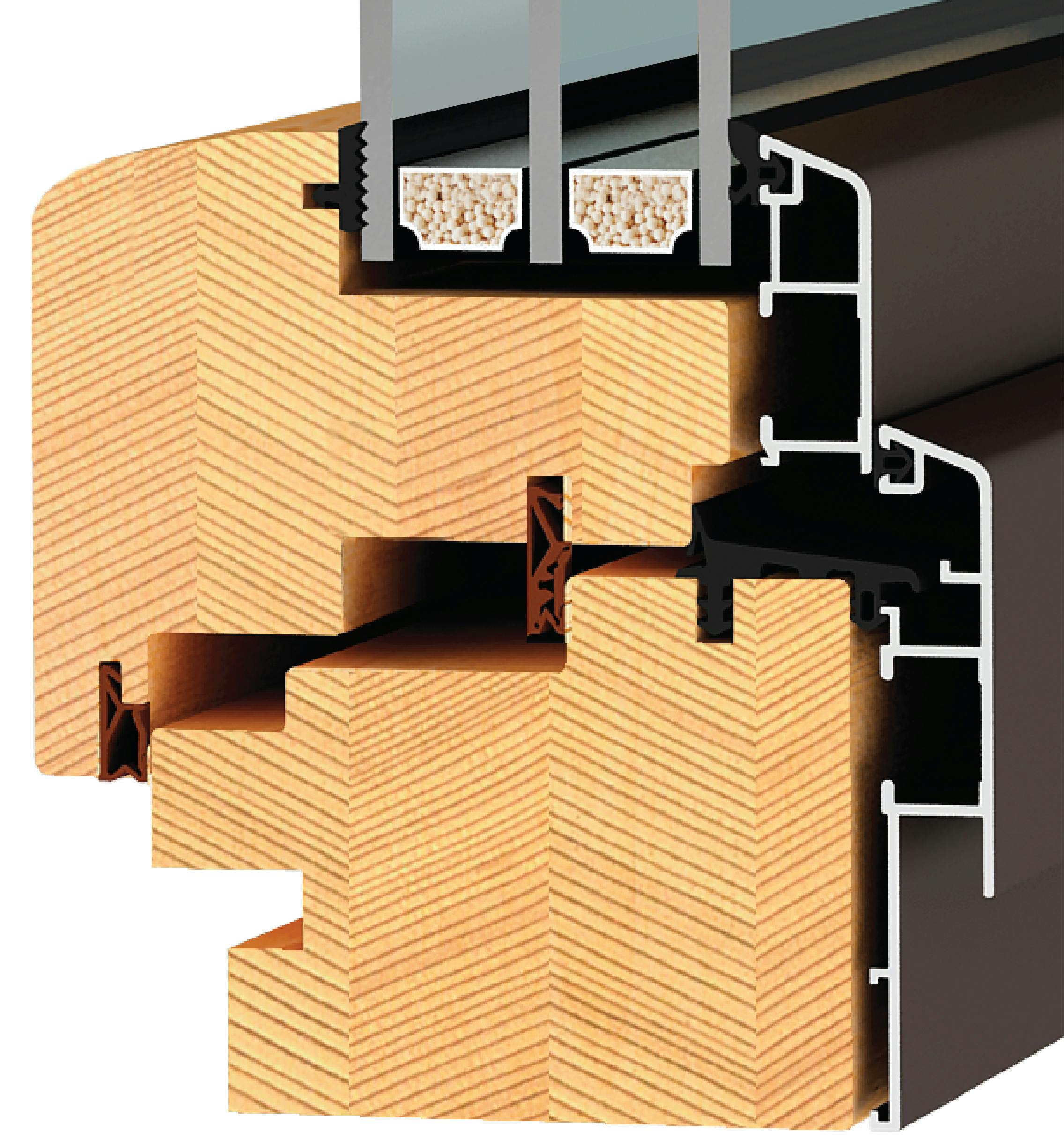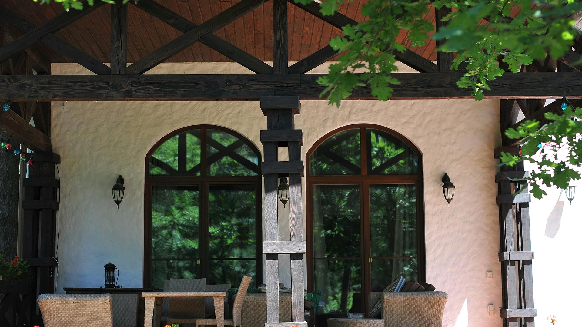 Сосновий зрощений дерев’яний брус, система “Термоплюс-78”, лакофарбове покриття Adler, колір "Goverla 2061" (натуральний ефект). Алюмінієва накладка системи Gemini classic, колір RAL 7016 mat, склопакети товщиною 48 мм, мультифункційні