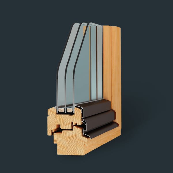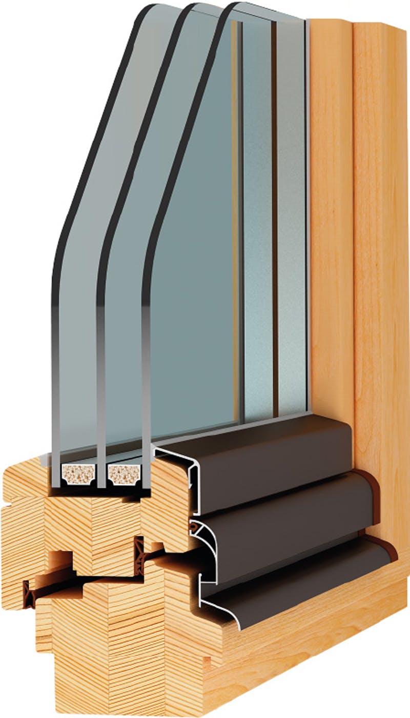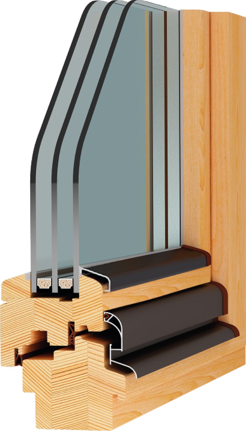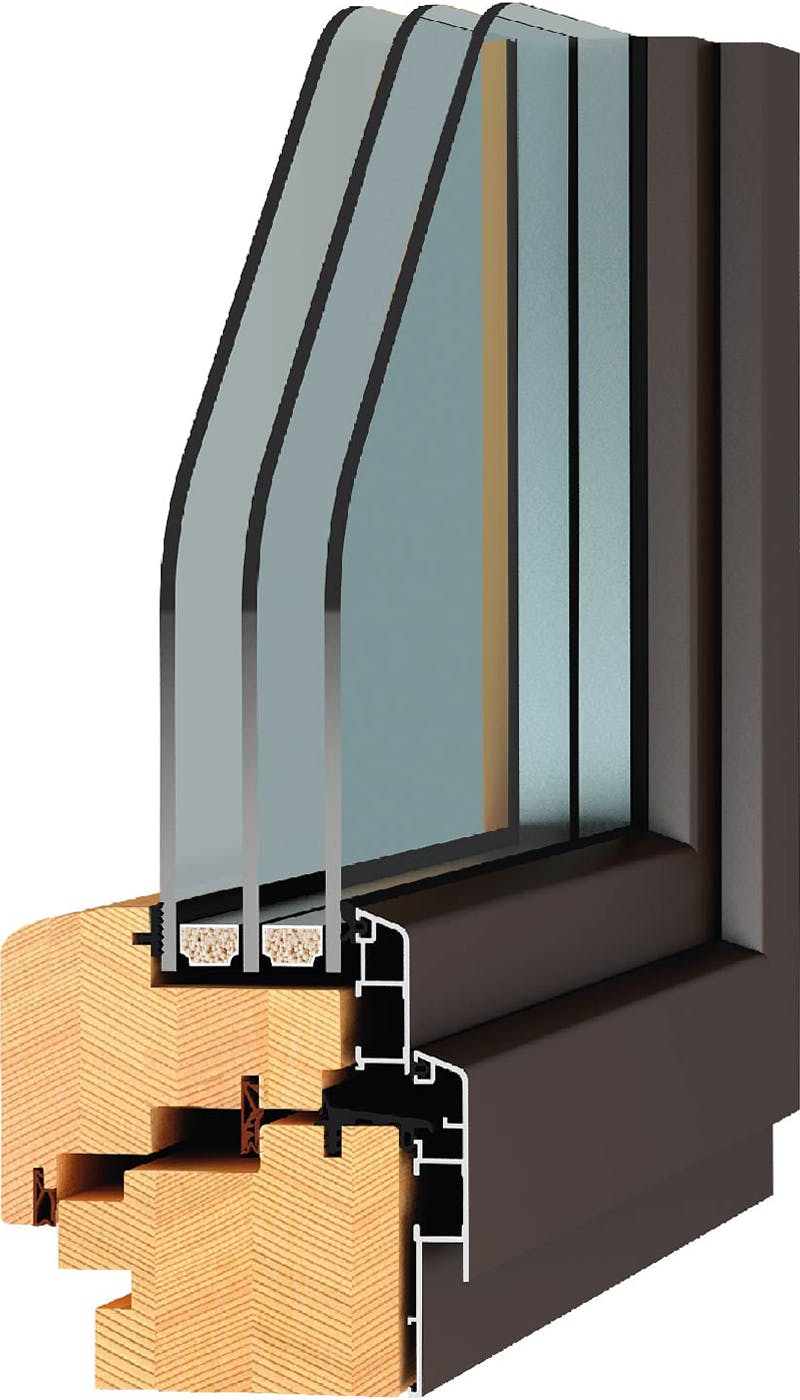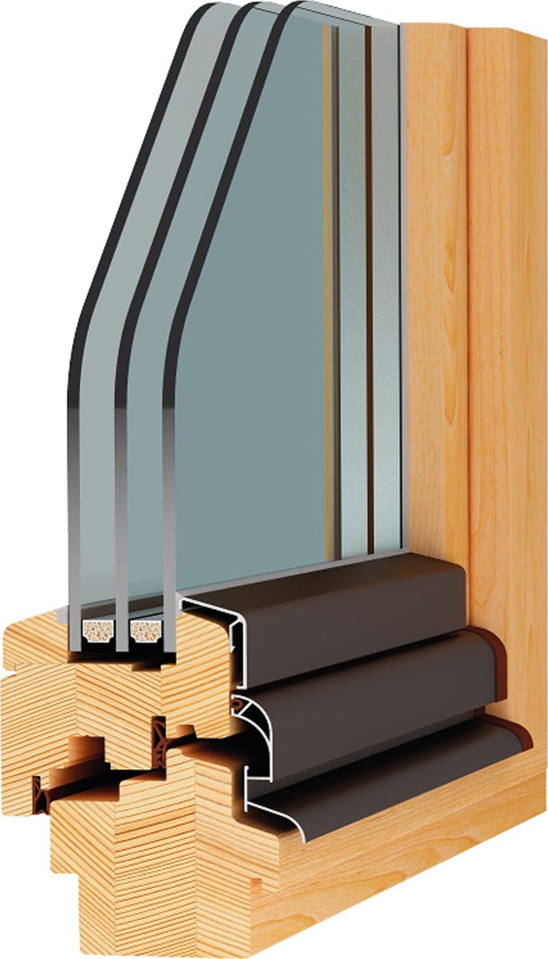 Сосновий цільноламельний дерев’яний брус, система “Passive-92”, лакофарбове покриття Sikkens, колір “Афромозія". Алюмінієва накладка системи Gemini Soft Line, колір Ral 7016, мультифункційний склопакет товщиною 48 мм.