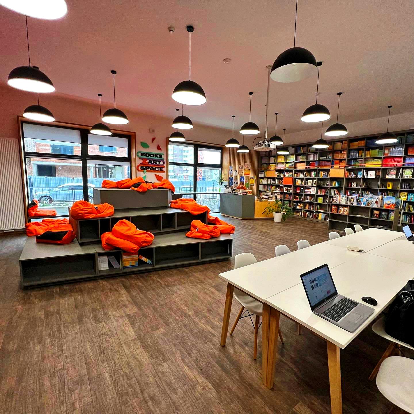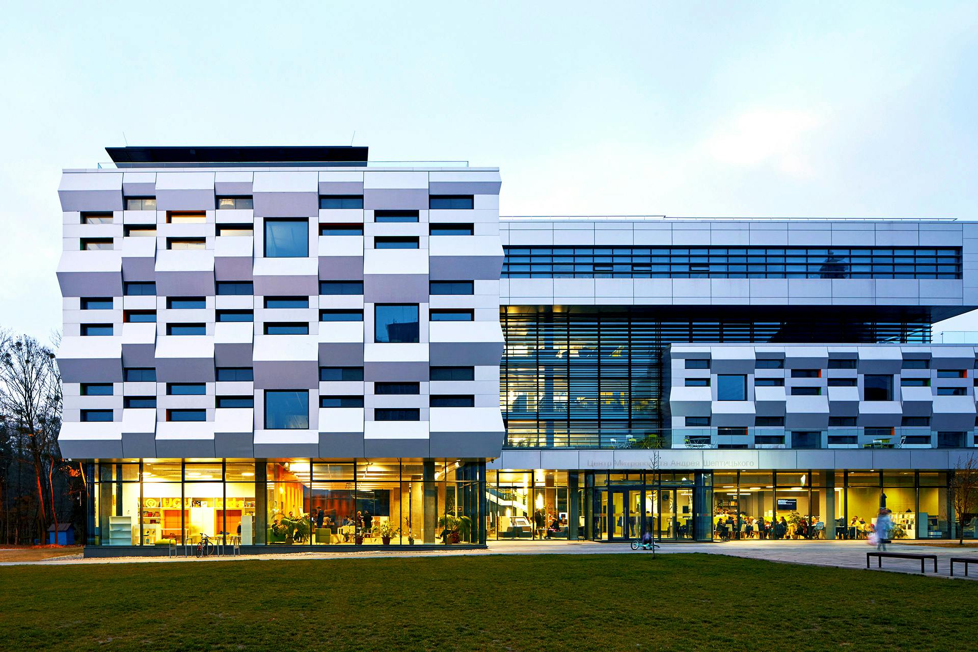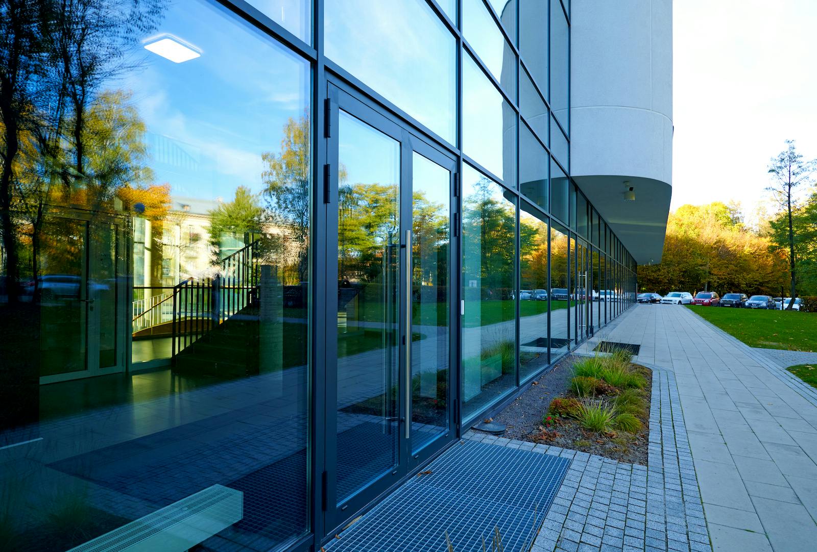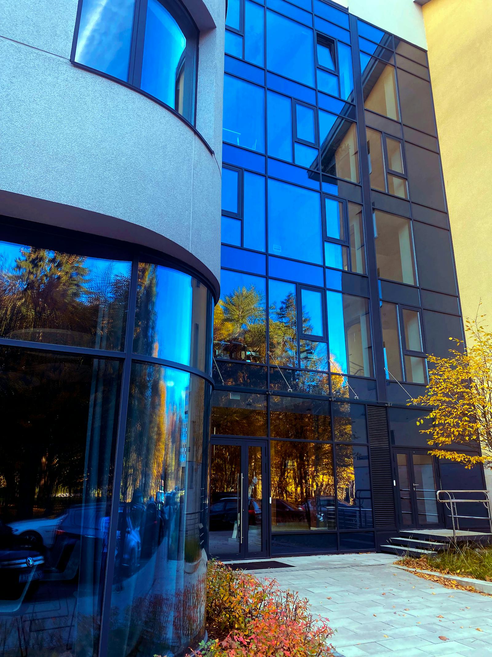 Скляні алюмінієві фасади система Reynaers CW 50 HI, колір RAL 7016, дверна група CS 77 HI. Склопакети двокамерні з мультифункційним та енергозберігаючим склом. Білі склопакети – це емаліти пофарбовані в колір Ral 9018